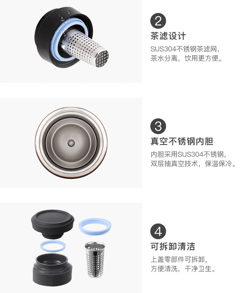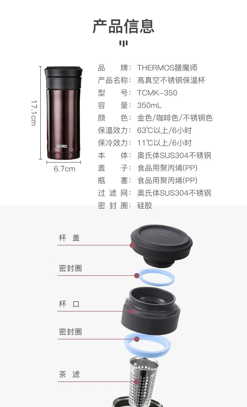颜 色:酒红CBW 不锈钢SBK 金色GL 容 量:350ml 保温效力:63C以上(6小时) 保冷效力:10C以下(6小时) 外管材质:304不锈钢 内管材质:304不锈钢 密封圈:食品级硅胶 茶漏材质:304不锈钢、食品级PP、食品级硅胶