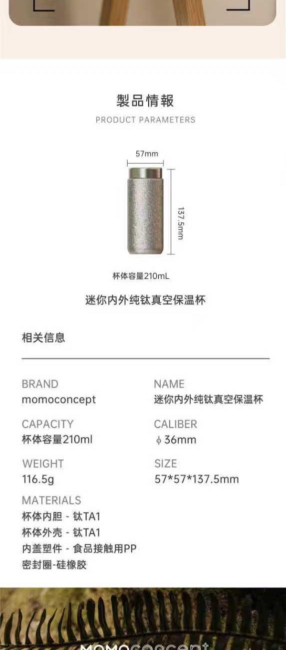产品材质:纯钛(含钛99%以上)杯体内胆-钛TA1/杯体外壳-钛TA1内盖塑件-食品接触用PP密封圈-硅橡胶 容 量:210ML 口 径:36mm 颜 色:晶耀-白 产品尺寸:57*57*137.5mm 产品净重量:116.5 整箱数:12只/箱 产品卖点:轻盈新「钛」度 航天级材质,轻量化设计 随行装包,无惧漏水专为小包设计 多种场合 轻松驾驭 商务办公 居家美学