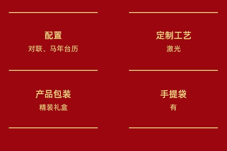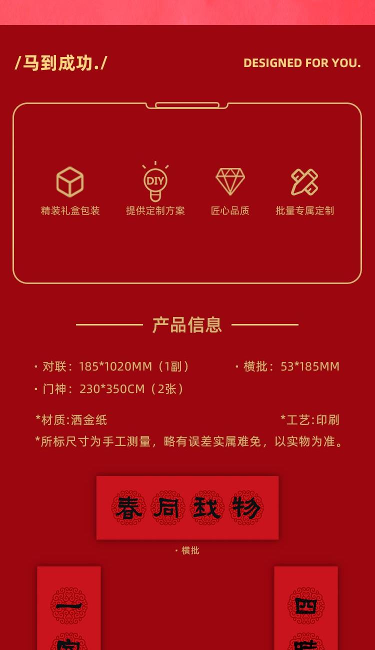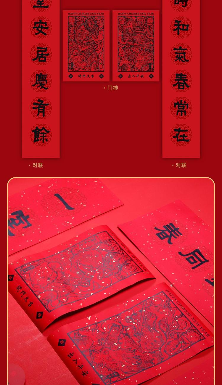 配置 春联*2横批*1 门神*2 台历 *1 材质 台历 艺术纸 撒金纸-触感纸 工艺:印刷烫金 春联185*1020cm*2 横批185*530cm*1 门神230*350cm*2 台历:128x215mm 礼盒:265*265*48mm