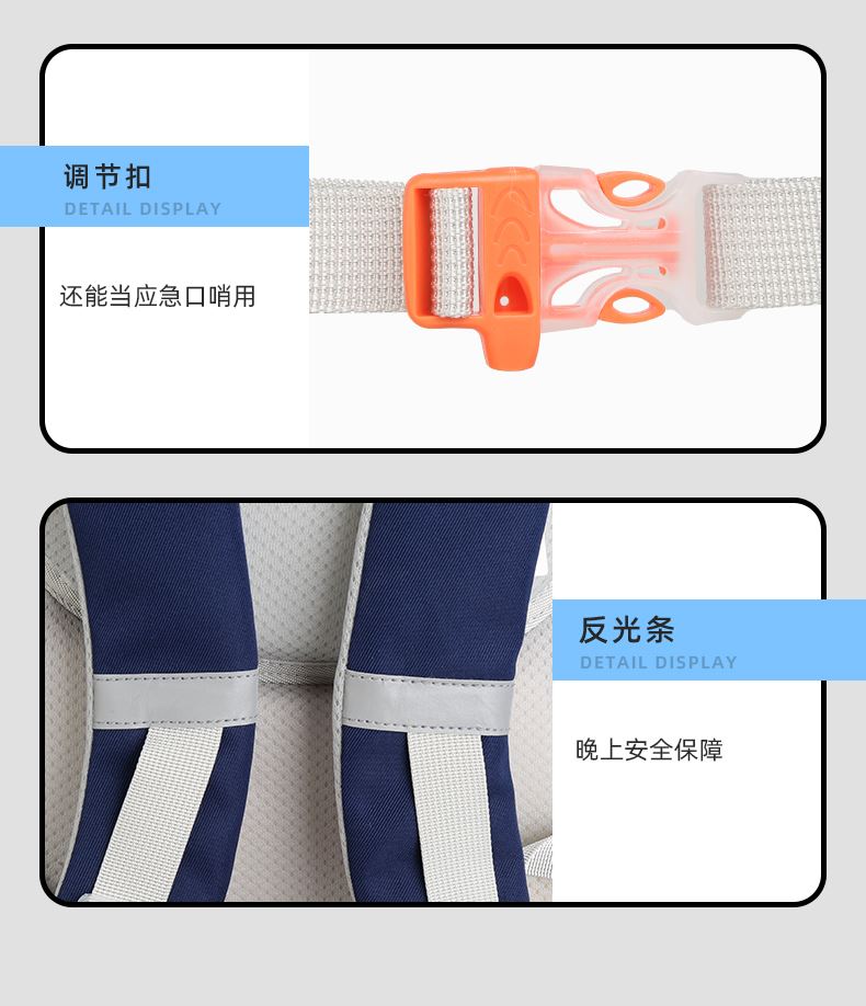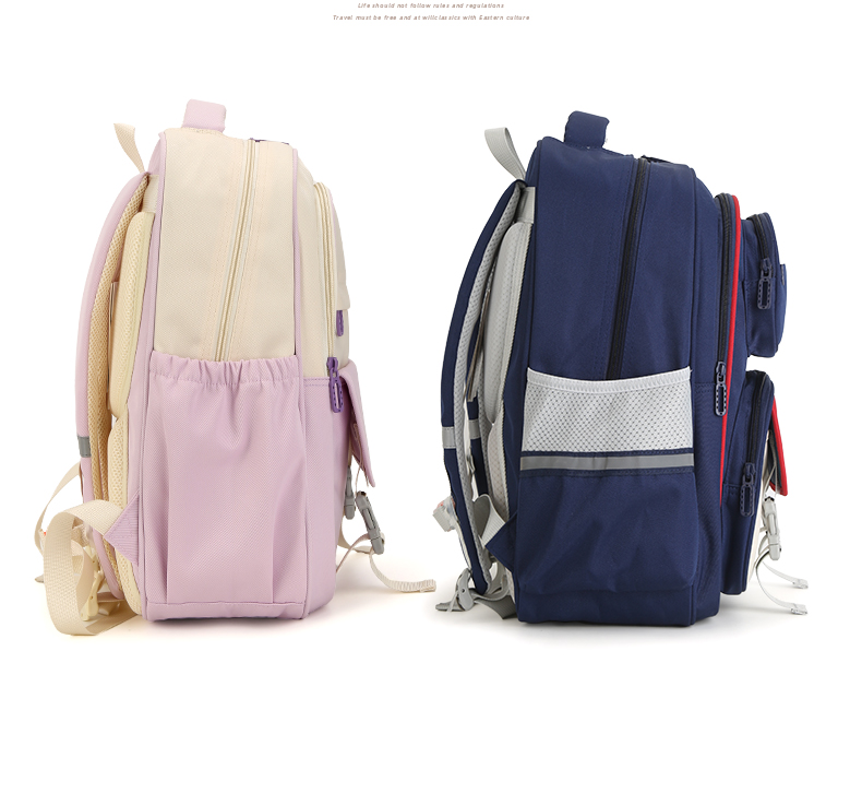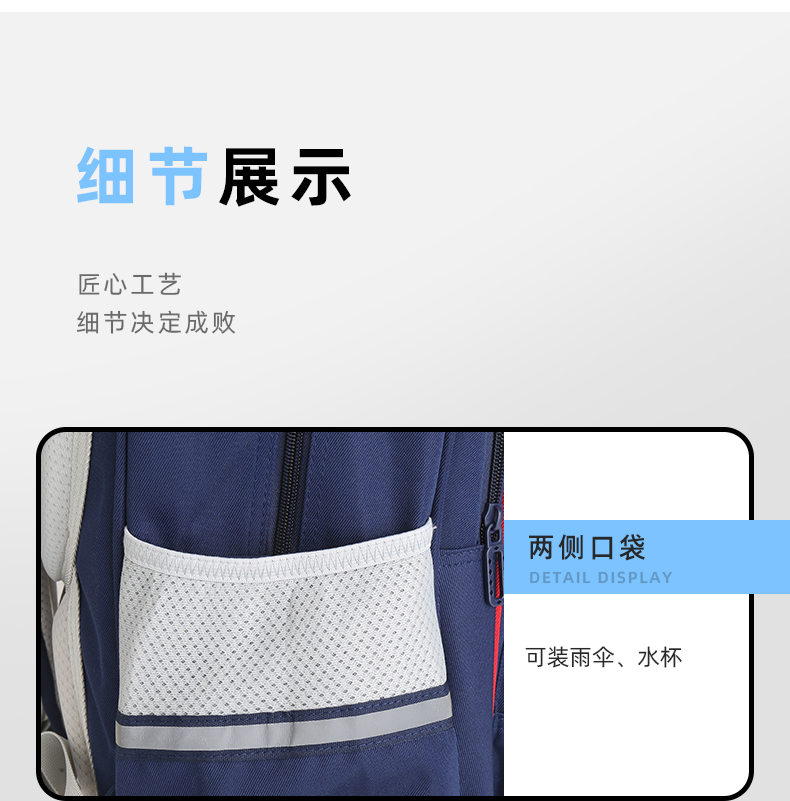 "1.尼龙斜纹洗水料 2.内部插袋 3.厚实手提 4.松紧侧袋【可放雨伞,水杯】 5.双插扣前袋 6.峰巢后背,拒绝闷热,立体峰巢棉,通风透气不闷汗 7.调节扣/应急口削"
