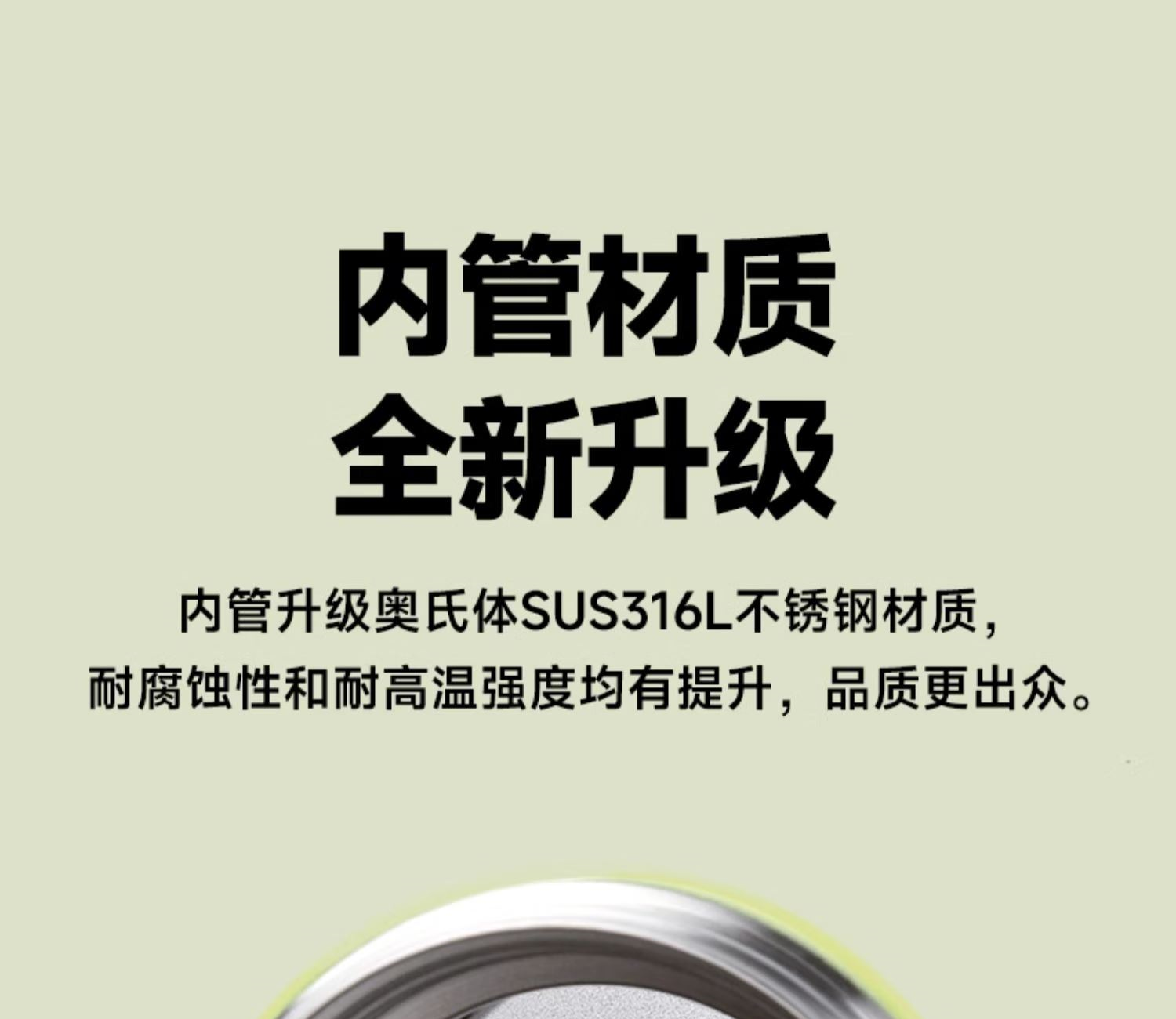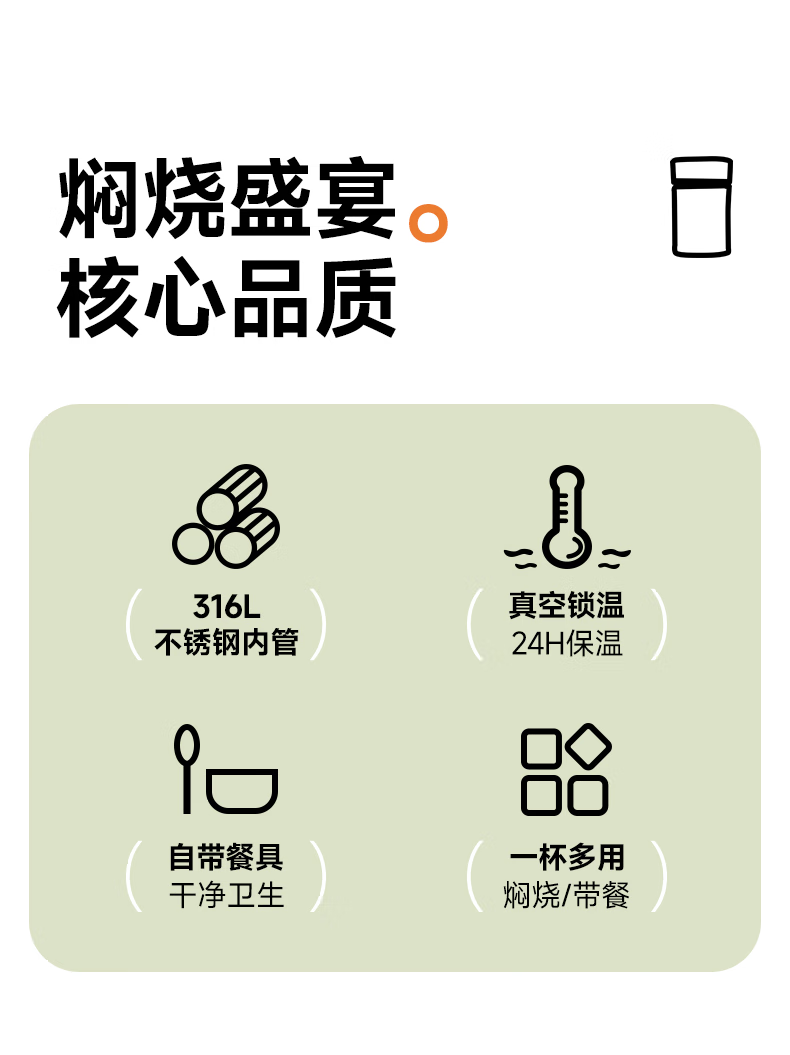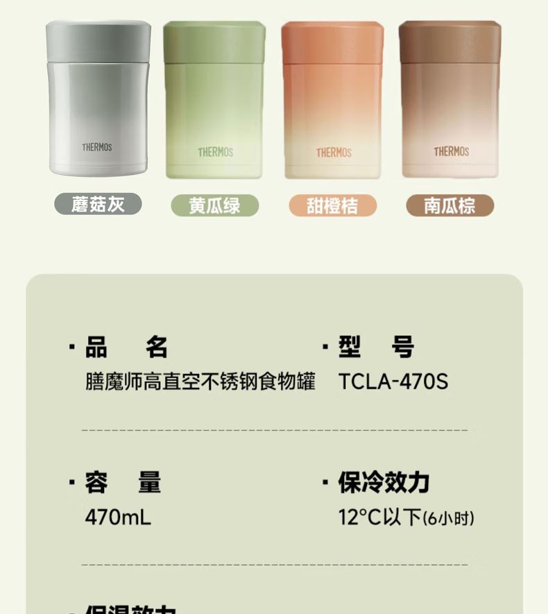 颜 色:OR橘色 GR绿色 BR棕色 PK粉色 GY灰色 容 量:470毫升 保温效力:61℃以上/6小时 36℃以上/24小时 保冷效力:12C以下(6小时) 外管材质:304不锈钢 内管材质:316L不锈钢 盖子材质: 304不锈钢 丙烯与乙烯的聚合物(PP) 瓶塞材质: 丙烯与乙烯的聚合物(PP) 聚丙烯(丙烯均聚物)(PP) 汤勺材质: 304不锈钢 密封圈:食品级硅胶