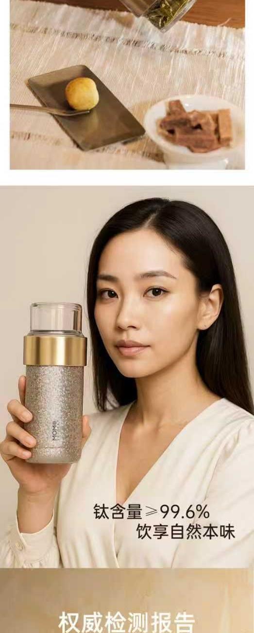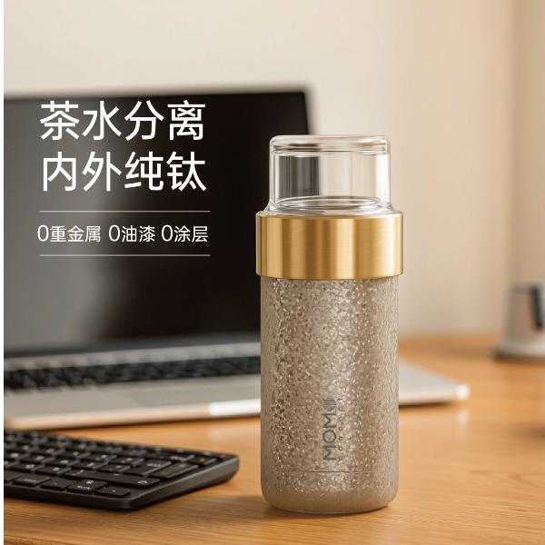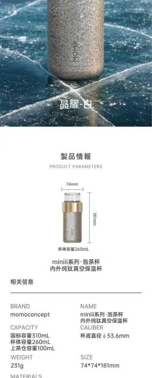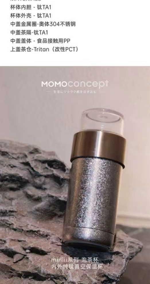 产品材质:纯钛(含钛99%以上)杯体内胆-钛TA1杯体外壳-钛TA1中盖金属圈-奥体304不锈钢中盖茶隔-钛TA1中盖盖体-食品接触用PP上盖茶仓-Tritan(改性PCT)