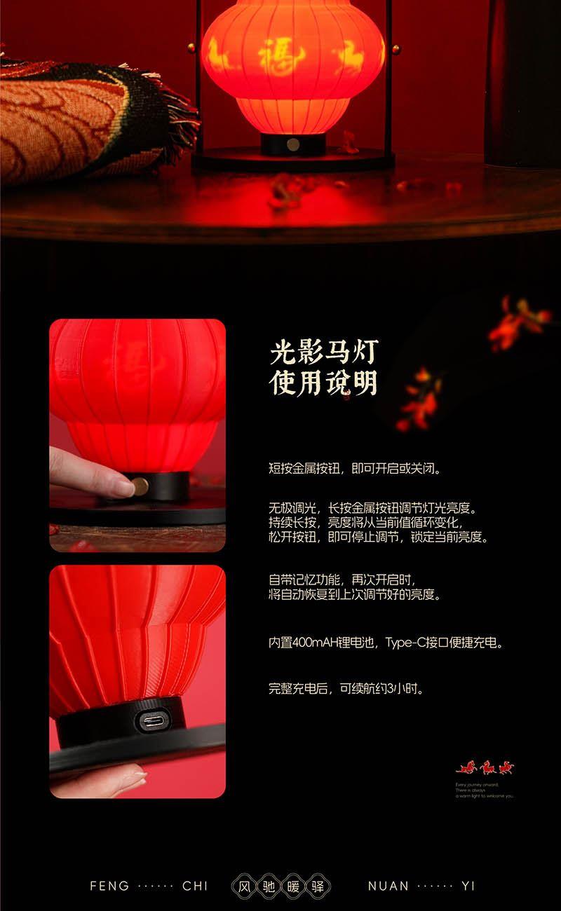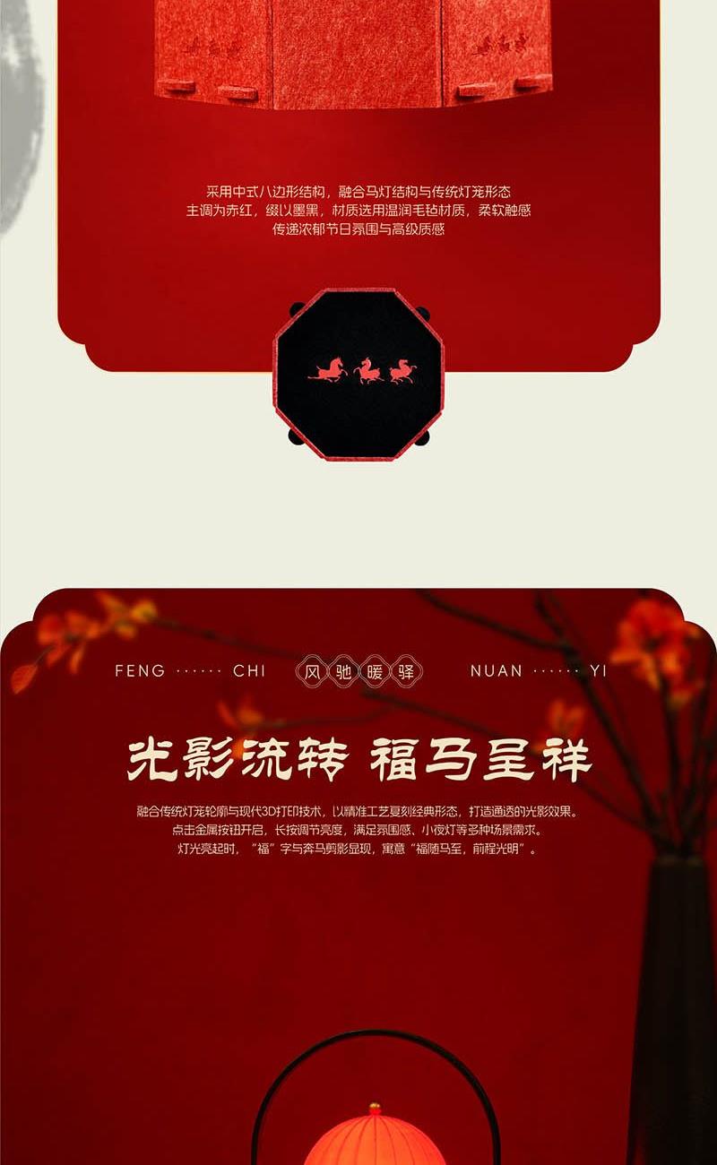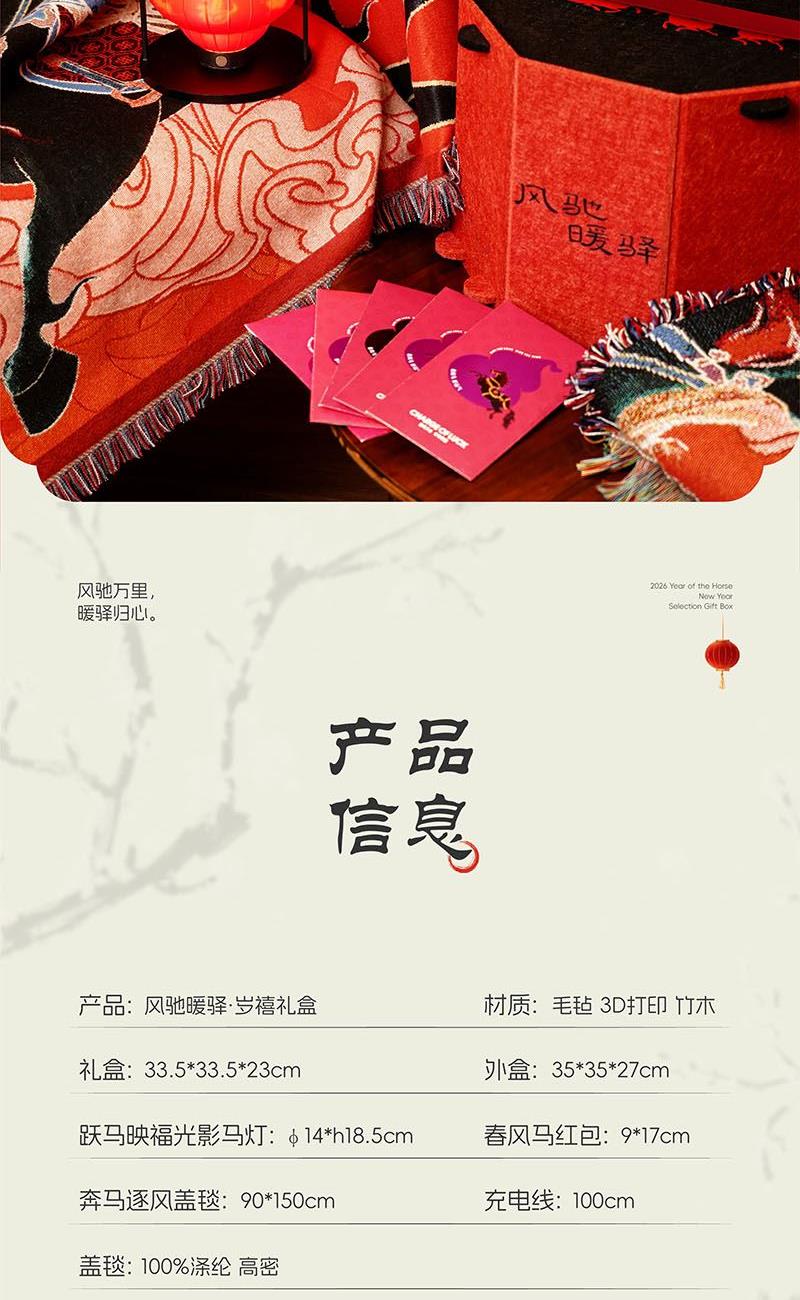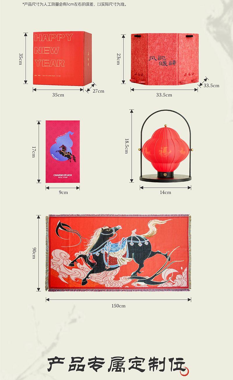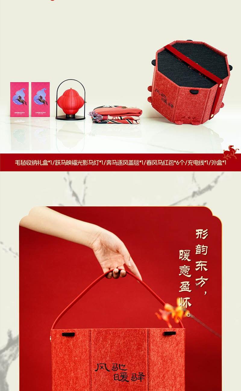礼盒清单 毛毡收纳礼盒*1 光影拍拍马灯*1 奔马逐风沙发毯/盖毯*1 春风马红包*6个 充电线*1 外盒*1 产品信息 产品 / Product Mini 风驰暖驿·岁禧礼盒 材质 / Material 毛毡 3D打印 竹木 规格 / Size 礼盒:33.5*33.5*23cm礼袋:35*35*27cm 光影马灯:φ14*h18.5cm 马年沙发毯/盖毯:90*150cm 盖毯:高密涤纶 春风马红包:9*17cm 充电线:100cm