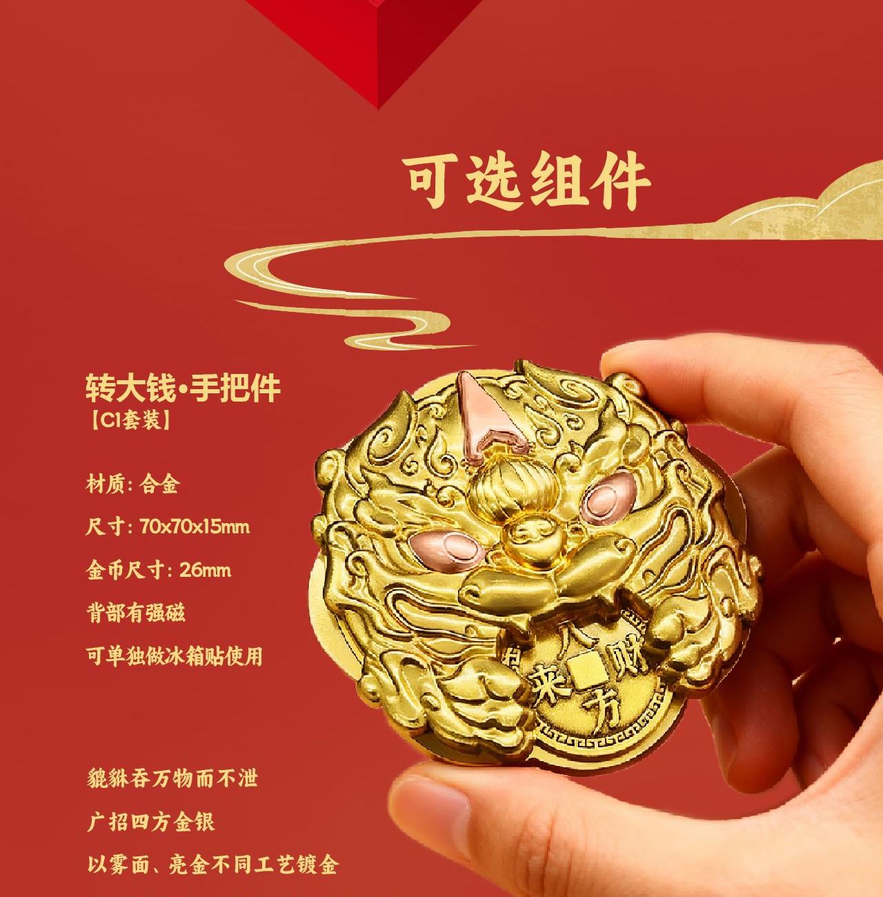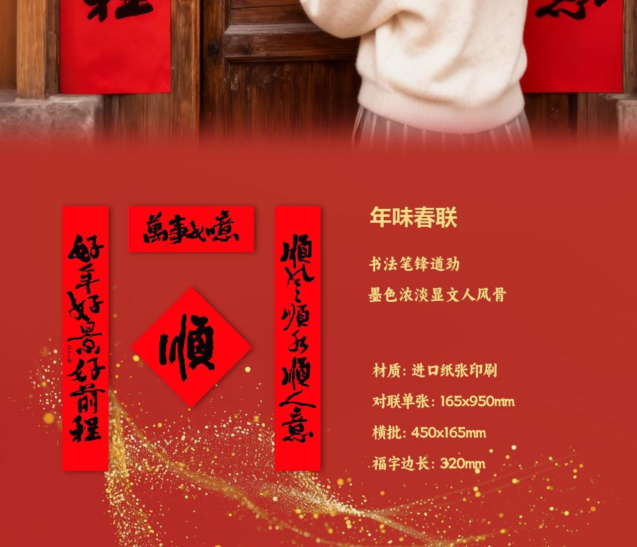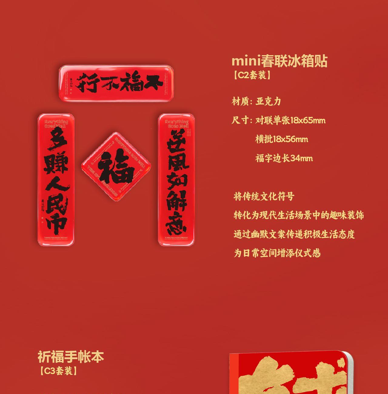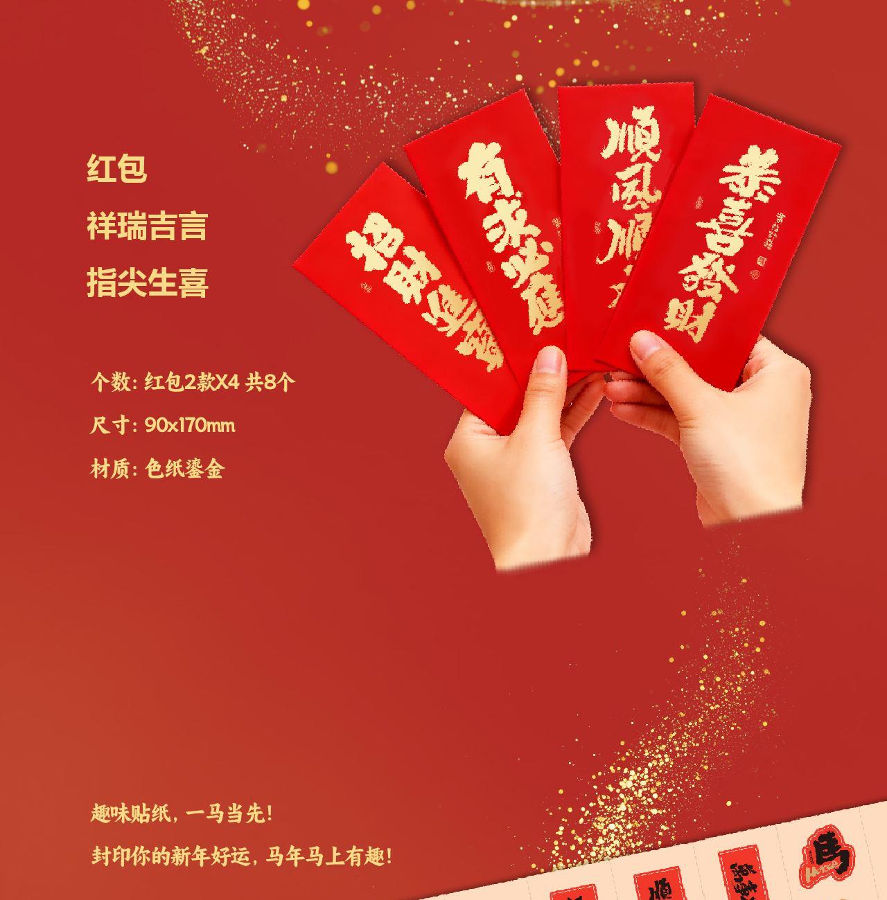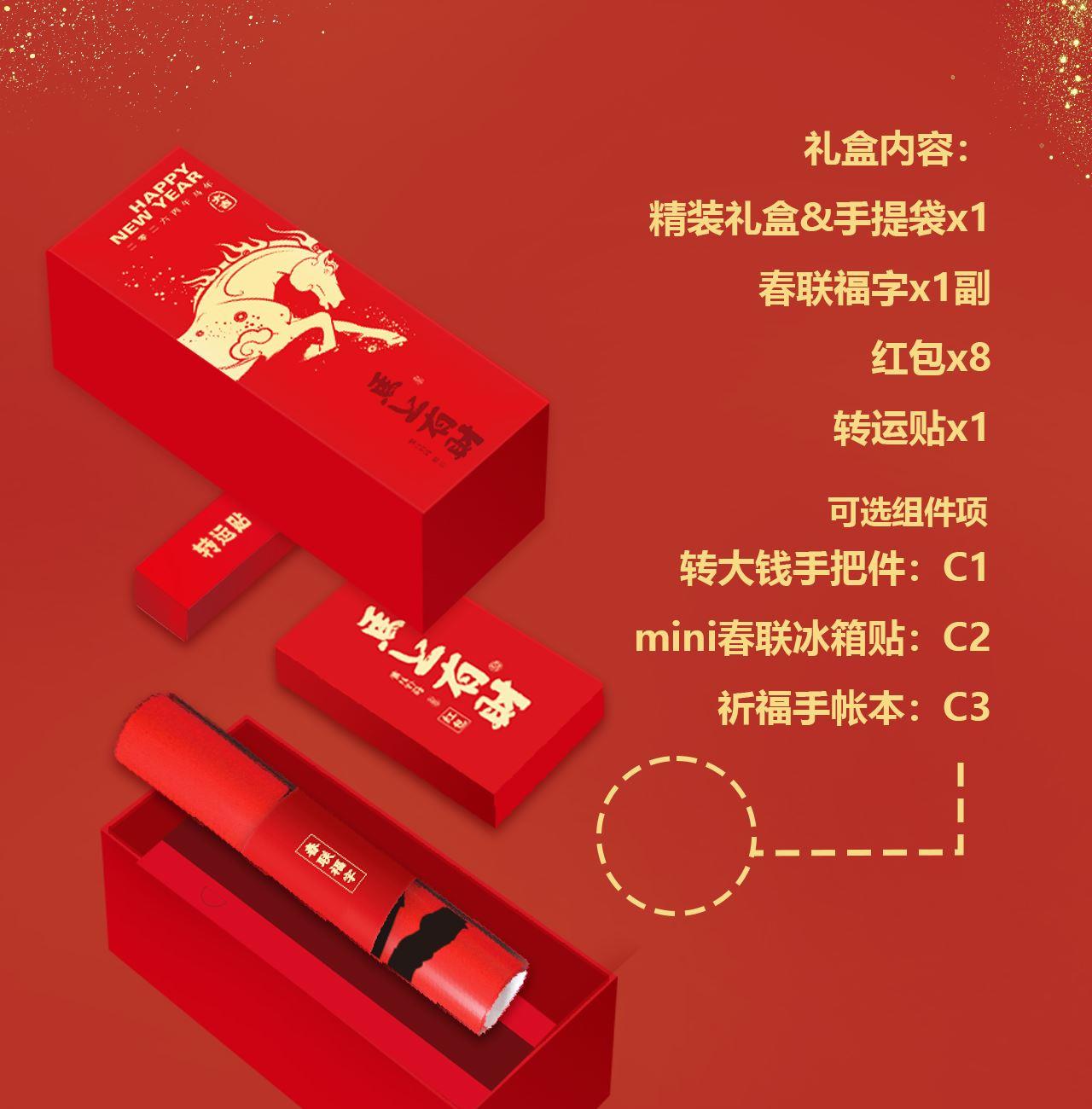 手提袋:105x350x75mm 礼盒:99x336x70mm 对联单张165x950mm 横批450x165mm 福字边长320mm 红包2款X4 共8个 90x170mm 转运贴:折叠36x90mm展开360x90mm 转大钱手把件:70x70x15mm mini春联冰箱贴 对联单张18x65mm 横批18x56mm 福字边长34mm 祈福手帐本85x120mm