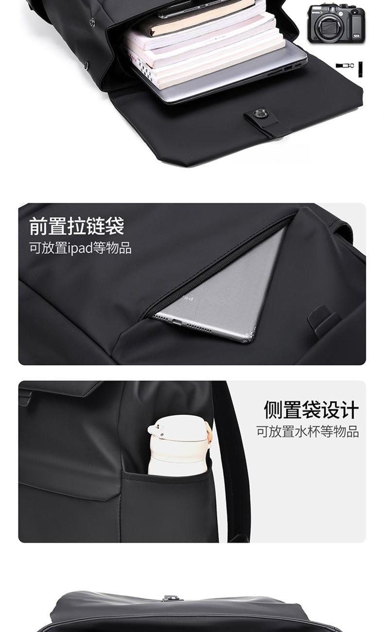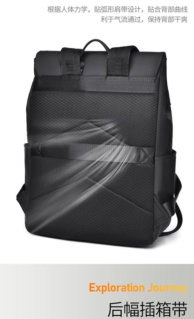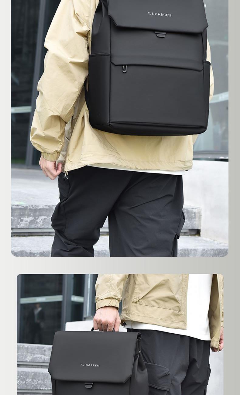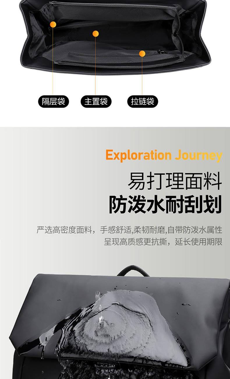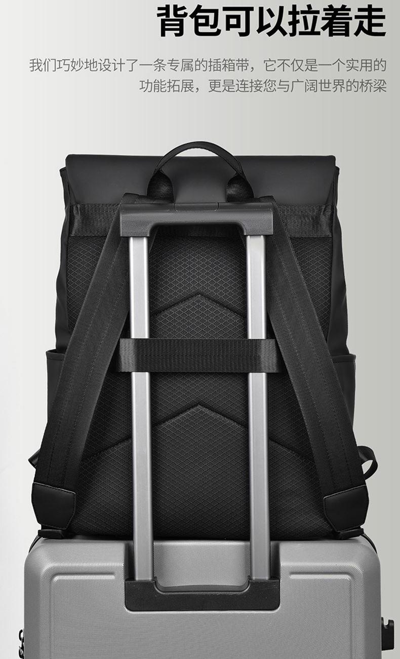 1、新款多功能设计,时尚大方,旅行休闲商务三用;2、柔性防水皮膜面料,一擦即干,轻松打理;3、多隔层结构,分区合理,轻松收纳;4、主袋约20L大容量,装的更多;5、独立加棉加厚电脑隔层袋,可放置15.6寸电脑;6、前置拉链袋、侧袋及内置袋,放置贴身物品;7、拉杆固定束带设计,解放双手;8、透气背负系统,配合加大加厚提手与肩带,可背可提、透气干爽,舒适减压出行;9、支持客户定制。
