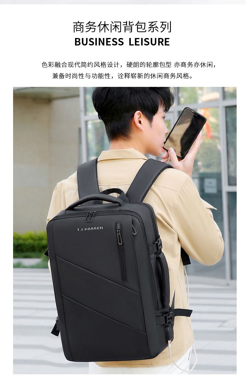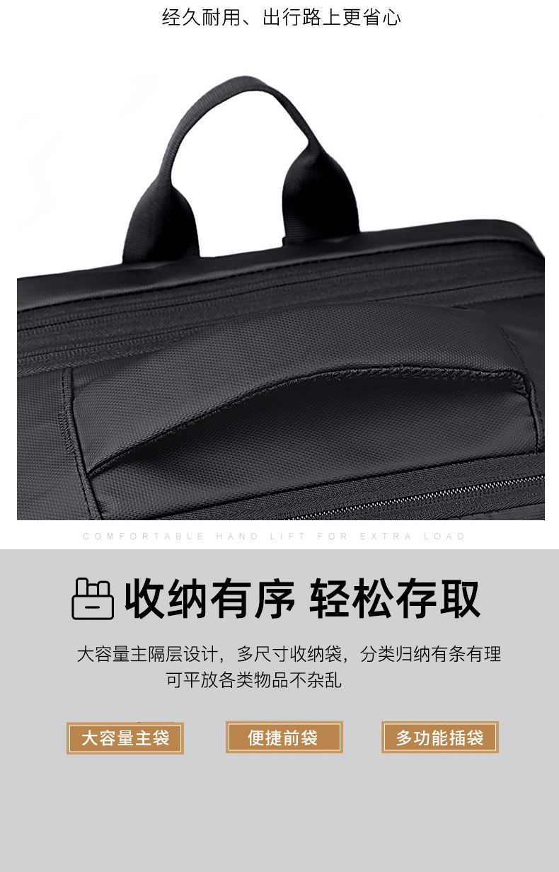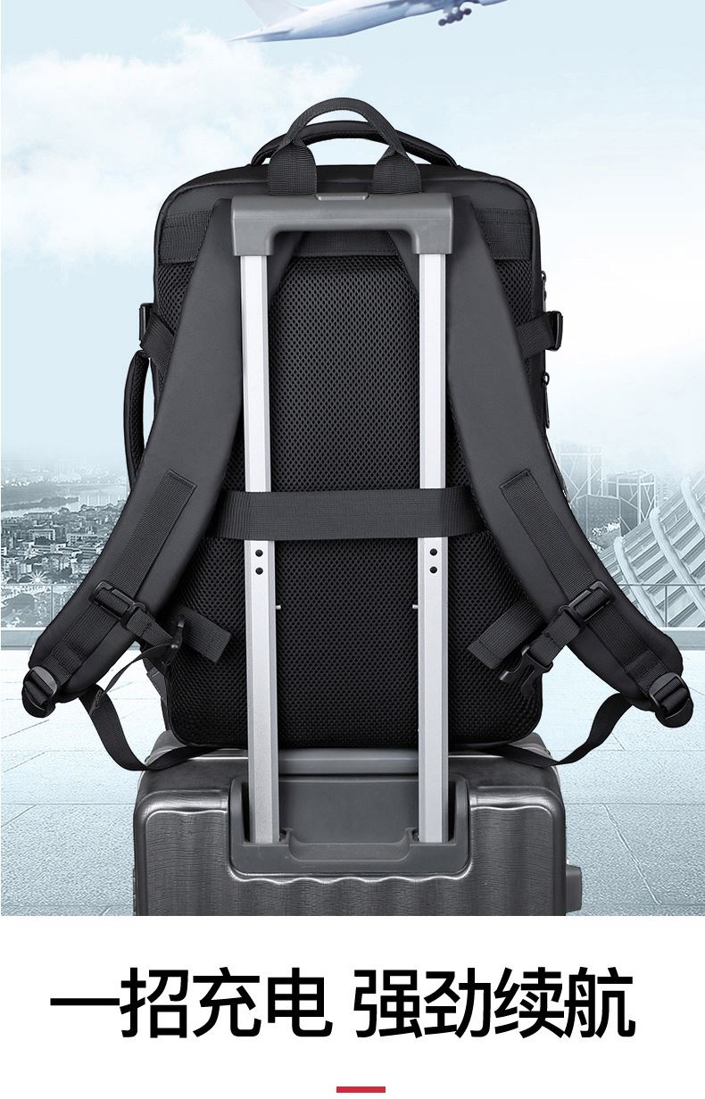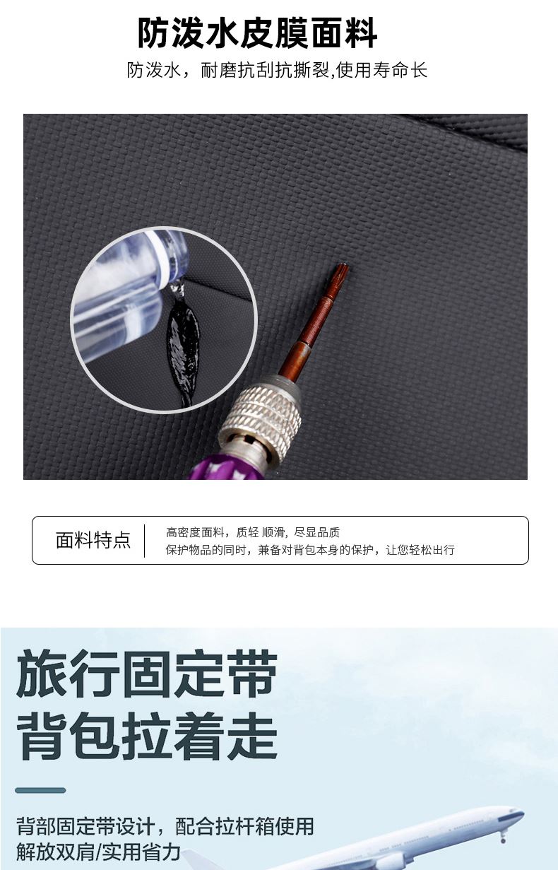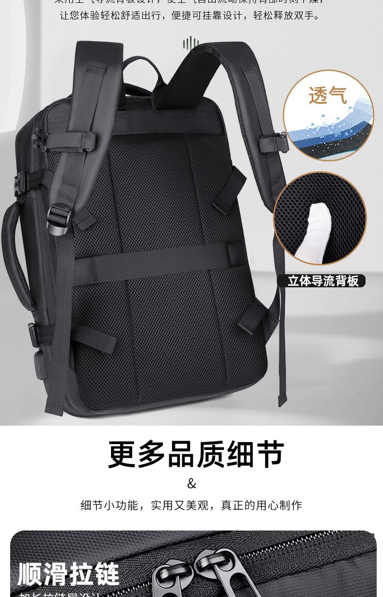 1、新款多功能可扩容设计,超大容量,旅行休闲商务三用;2、柔性防水皮膜面料,一擦即干,轻松打理;3、多隔层结构,分区合理,轻松收纳;4、双主袋扩容前共约22L大容量,适合日常通勤;5、双主袋扩容后共约36L大容量,适合长途旅行;6、独立加棉加厚电脑隔层袋,可放置15.6寸电脑;7、2个大容量前置拉链袋,放置贴身物品;8、带USB充电接口,充电更方便;9、多个内置物袋,方便收纳放置更多小物件;10、拉杆固定束带设计,解放双手;11、透气背负系统,配合加大加厚提手与肩带,可背可提、透气干爽,舒适减压出行;12、支持客户定制。