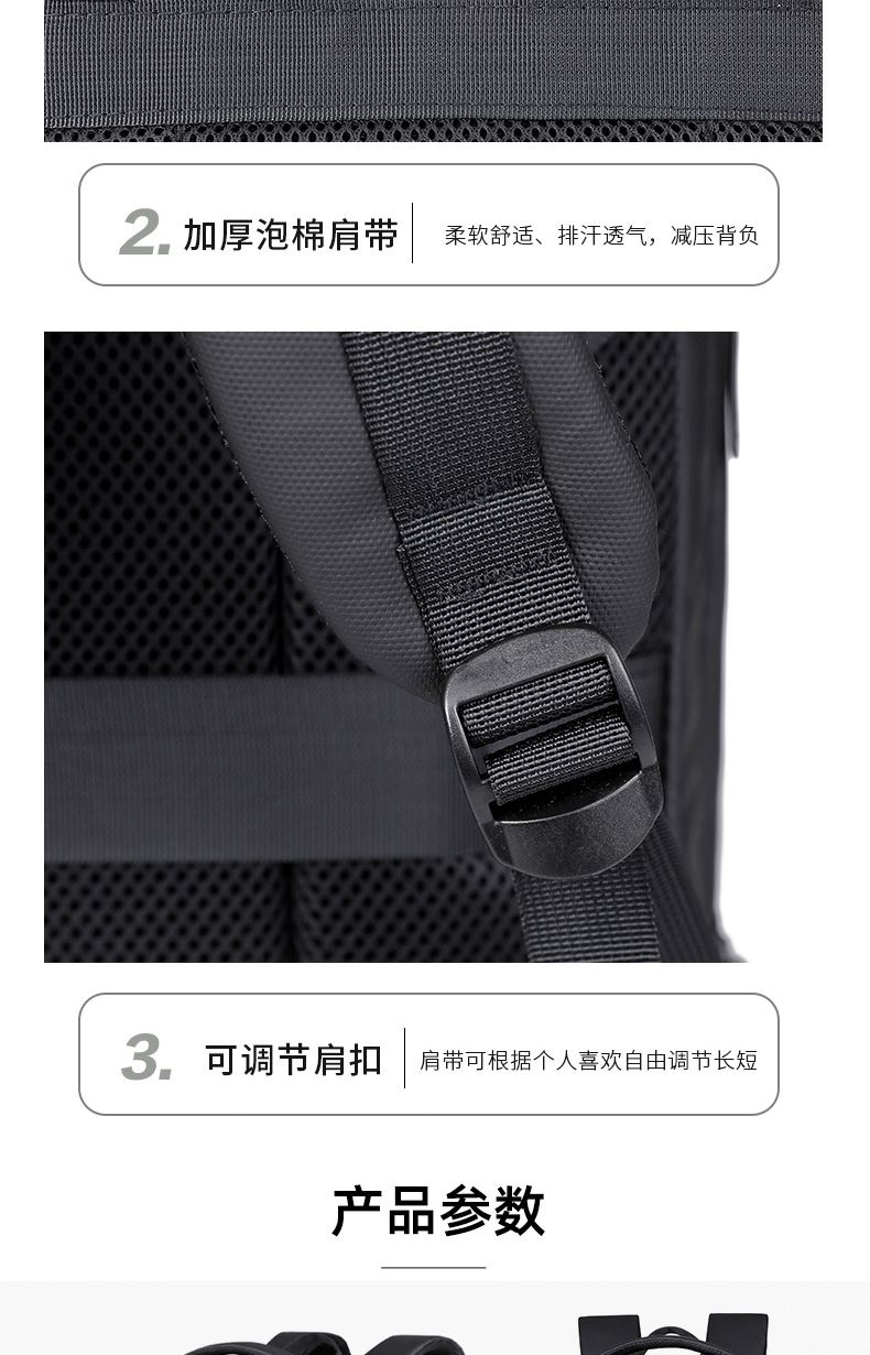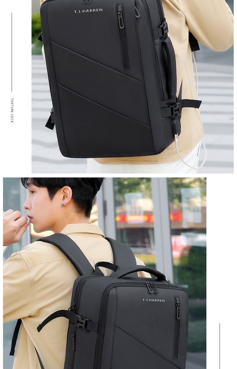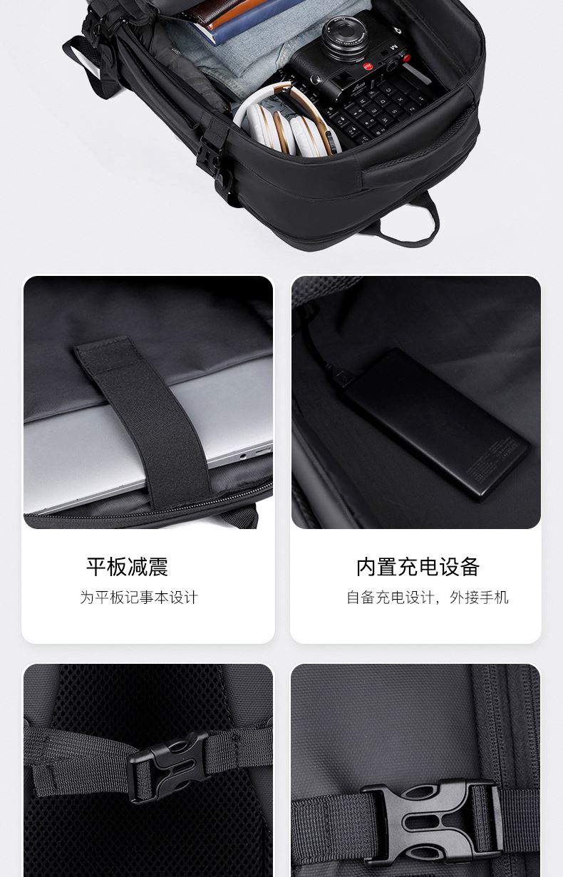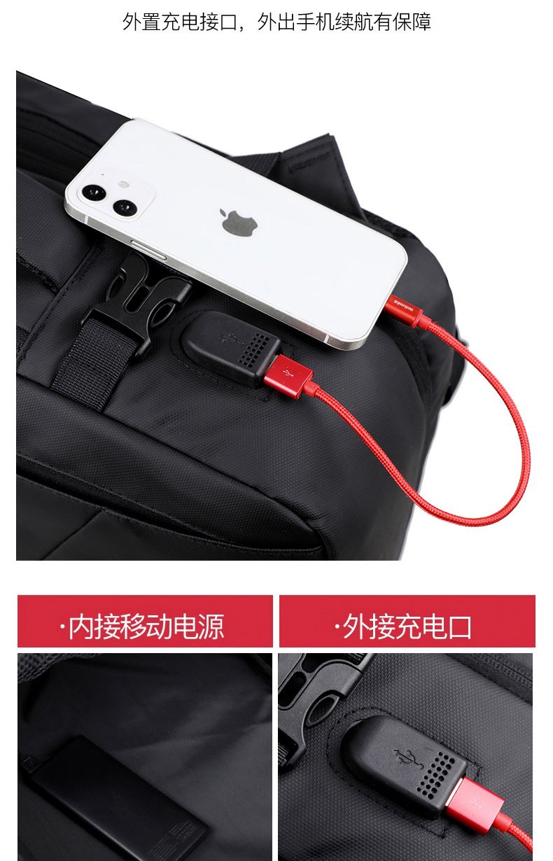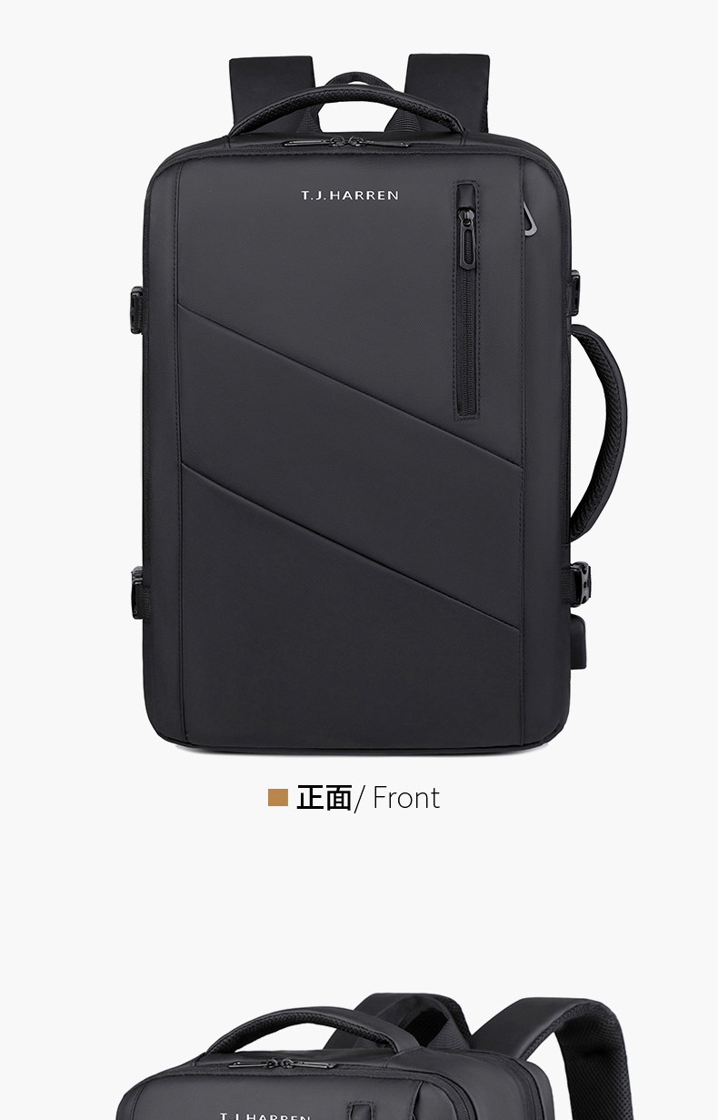 1、新款多功能可扩容设计,超大容量,旅行休闲商务三用;2、柔性防水皮膜面料,一擦即干,轻松打理;3、多隔层结构,分区合理,轻松收纳;4、双主袋扩容前共约22L大容量,适合日常通勤;5、双主袋扩容后共约36L大容量,适合长途旅行;6、独立加棉加厚电脑隔层袋,可放置15.6寸电脑;7、2个大容量前置拉链袋,放置贴身物品;8、带USB充电接口,充电更方便;9、多个内置物袋,方便收纳放置更多小物件;10、拉杆固定束带设计,解放双手;11、透气背负系统,配合加大加厚提手与肩带,可背可提、透气干爽,舒适减压出行;12、支持客户定制。