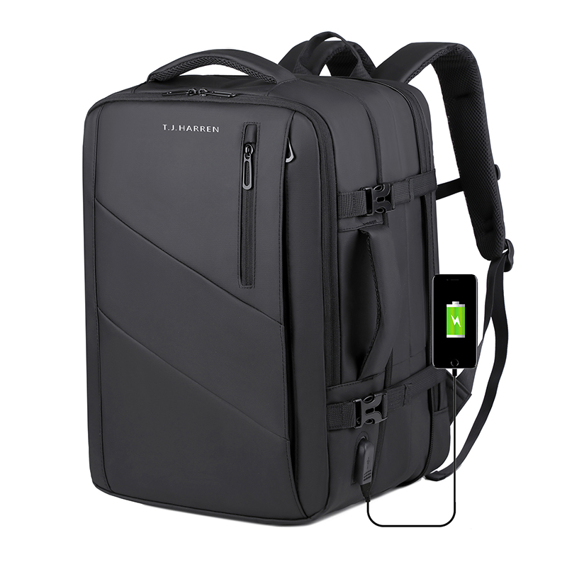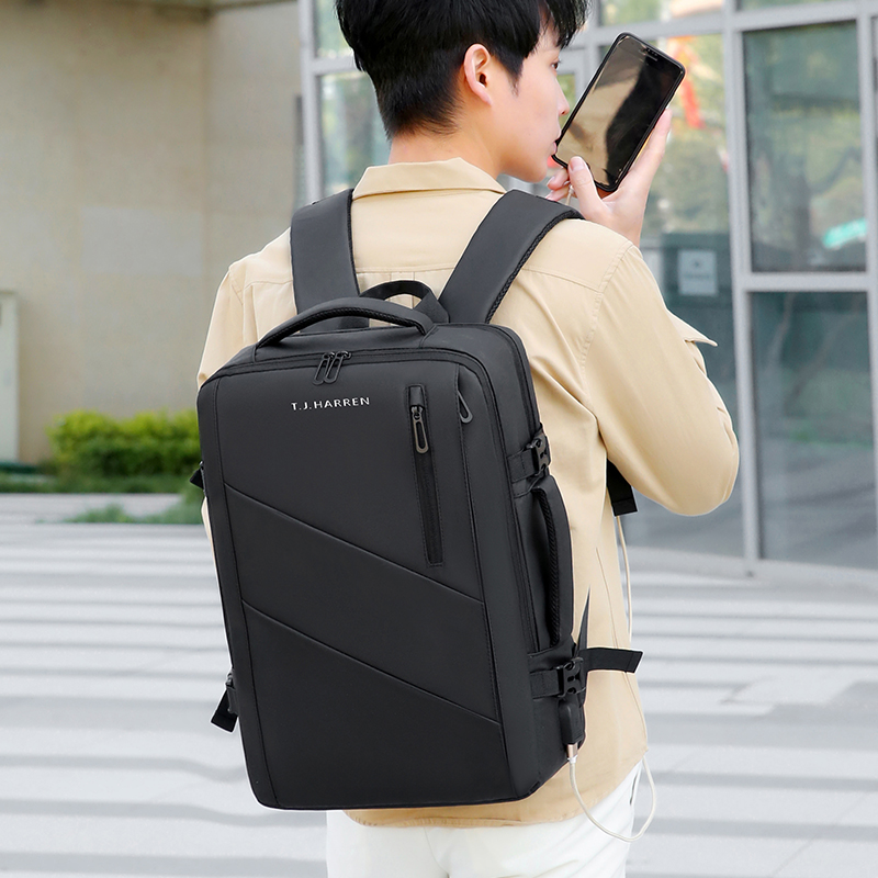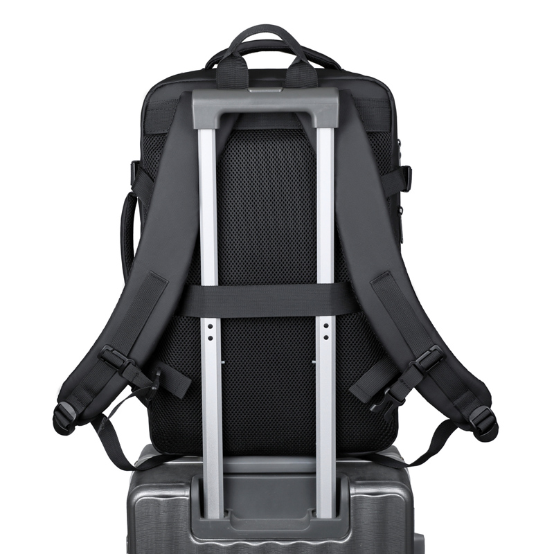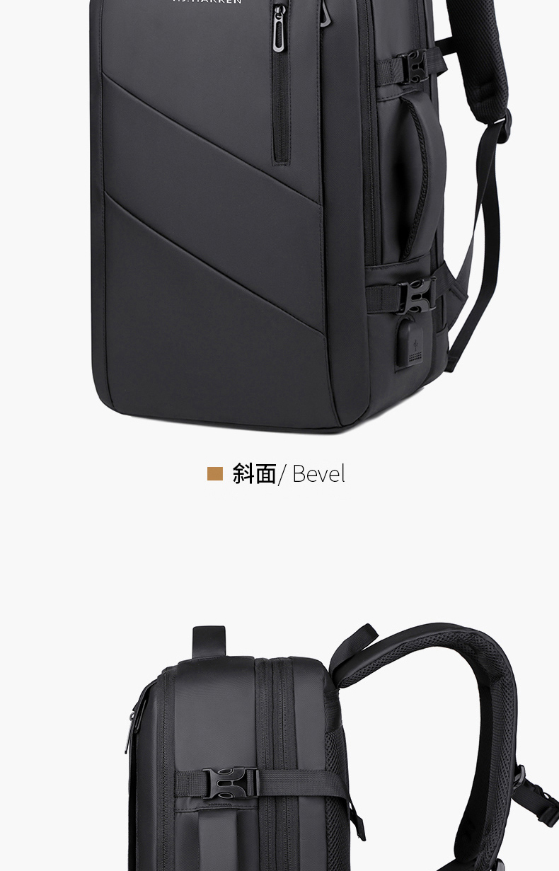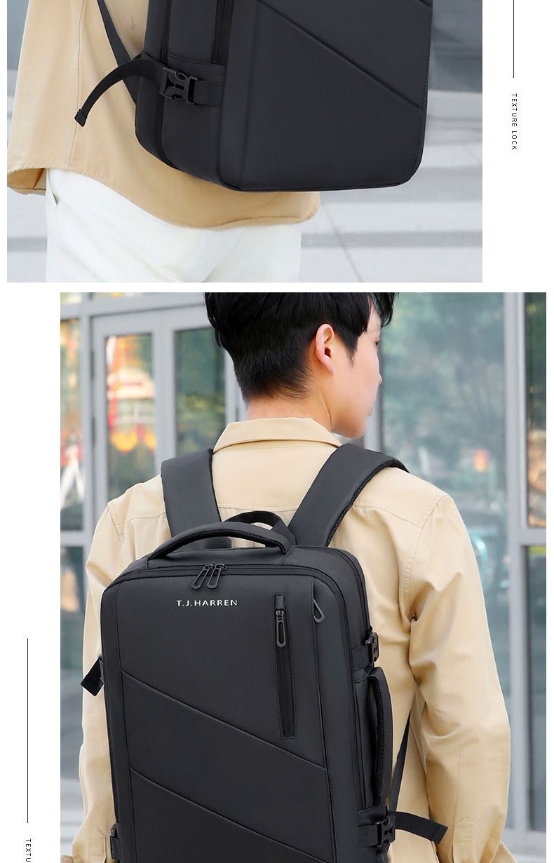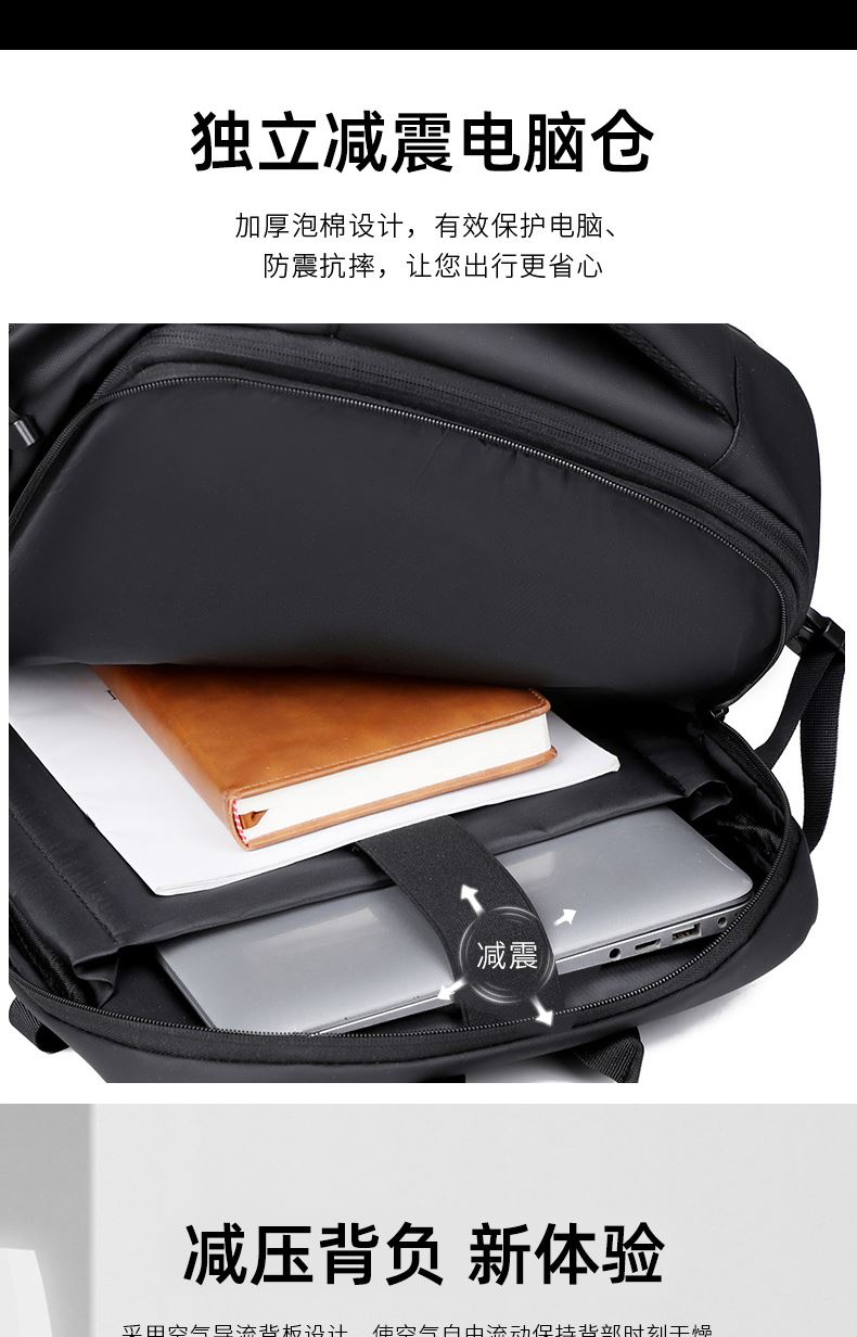 1、新款多功能可扩容设计,超大容量,旅行休闲商务三用;2、柔性防水皮膜面料,一擦即干,轻松打理;3、多隔层结构,分区合理,轻松收纳;4、双主袋扩容前共约22L大容量,适合日常通勤;5、双主袋扩容后共约36L大容量,适合长途旅行;6、独立加棉加厚电脑隔层袋,可放置15.6寸电脑;7、2个大容量前置拉链袋,放置贴身物品;8、带USB充电接口,充电更方便;9、多个内置物袋,方便收纳放置更多小物件;10、拉杆固定束带设计,解放双手;11、透气背负系统,配合加大加厚提手与肩带,可背可提、透气干爽,舒适减压出行;12、支持客户定制。