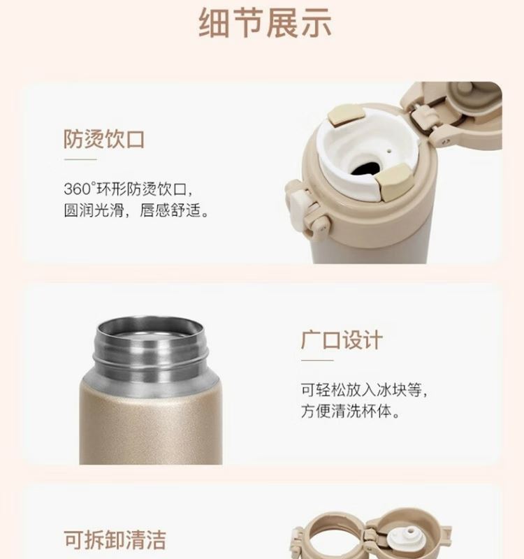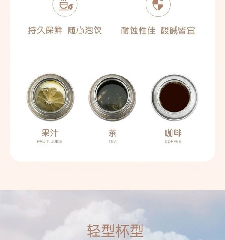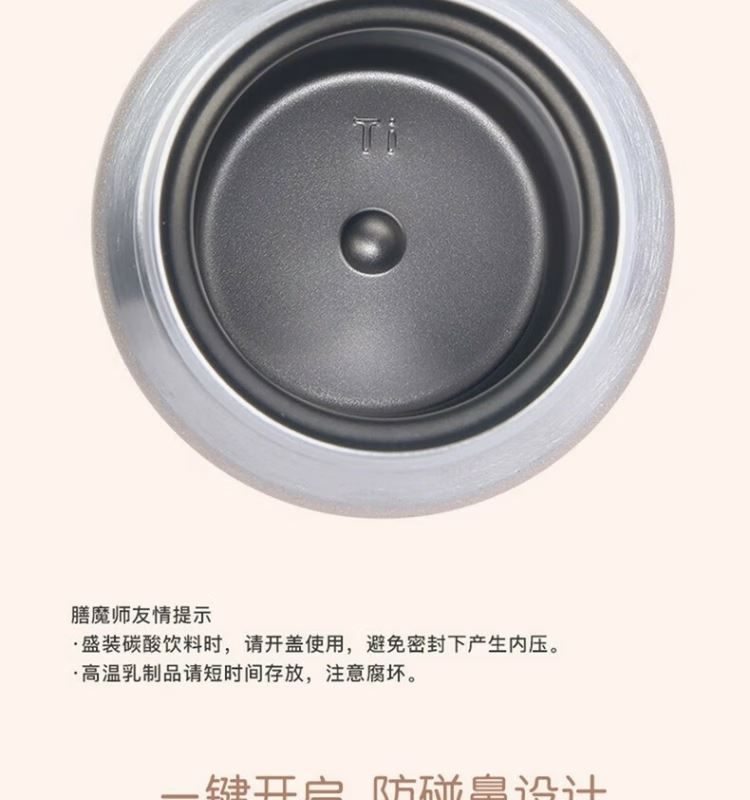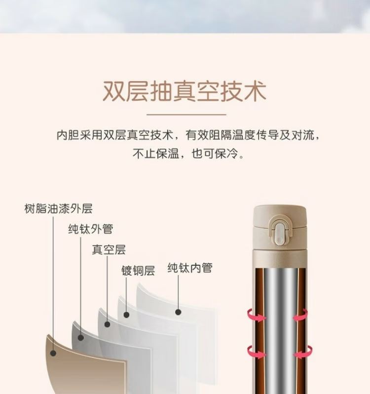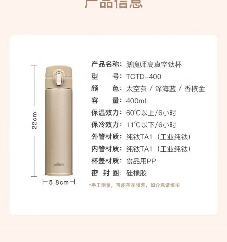颜 色:BGD 香槟金 BL 深海蓝 GY 太空灰 容 量:400毫升 保温效力:60℃以上/6小时 保冷效力:11C以下(6小时) 外管材质:纯钛TA1(工业纯钛) 内管材质:纯钛TA1(工业纯钛) 密封圈:食品级硅胶 杯盖材质:食品级PP