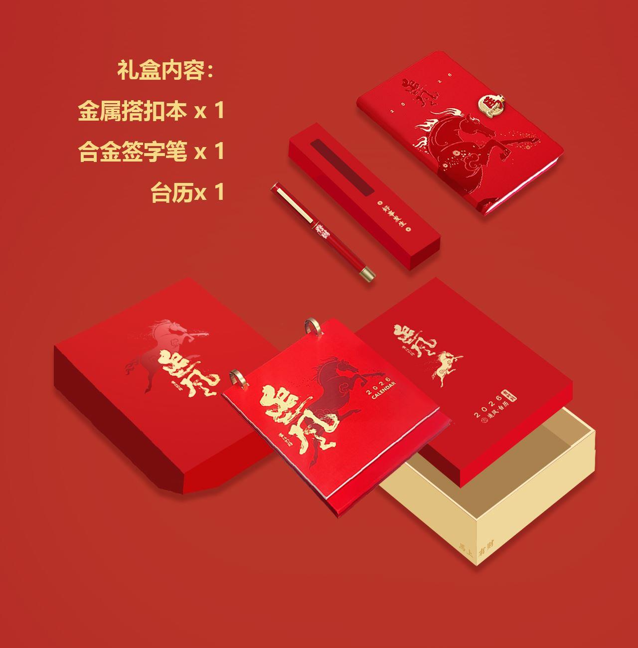 【礼品袋 x1】 材质:艺术纸 尺寸:200x250x55mm 【礼盒 x1】 材质:艺术纸 尺寸:185x222x45mm 【台历 x1】(W2款) 材质:艺术纸 尺寸:170x205x76mm 页数:15页 【搭扣笔记本 x1】 材质:意大利触感PU 尺寸:130x210mm 内页:100g米白护眼纸 页数:80张/160页 【签字笔 x1】 材质:合金 尺寸:11x134mm 笔芯:德国施耐德