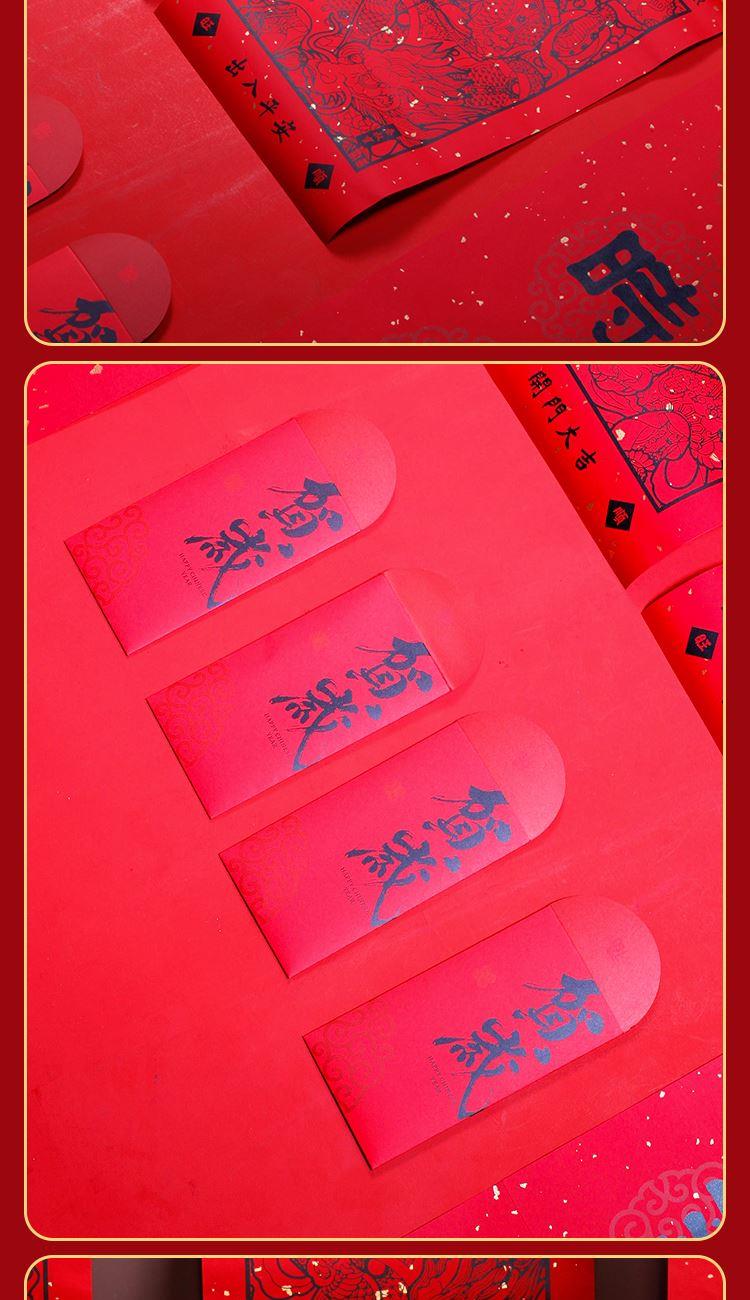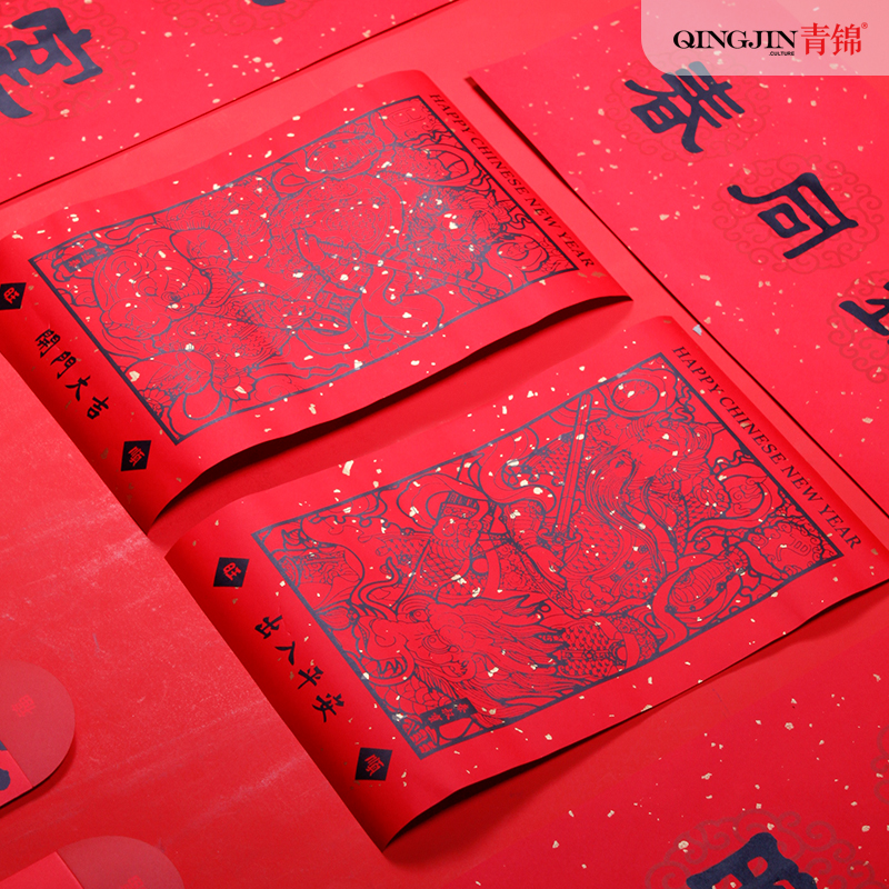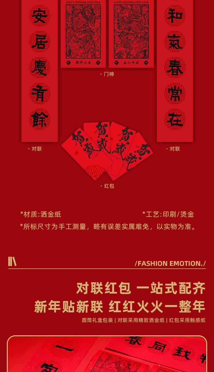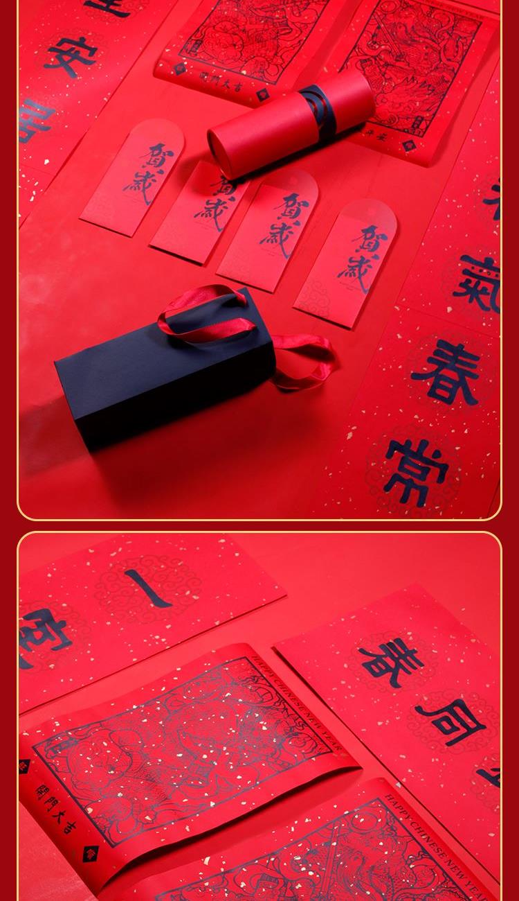 配置 春联185*1020cm*2 横批185*530cm*1 门神230*350cm*2 红包*4 圆筒礼盒手提袋*1 材质 撒金纸-触感纸 工艺:烫金 礼盒:255*80mm 撒金纸,圆筒式礼盒仪式感更强。新春物料一应俱全