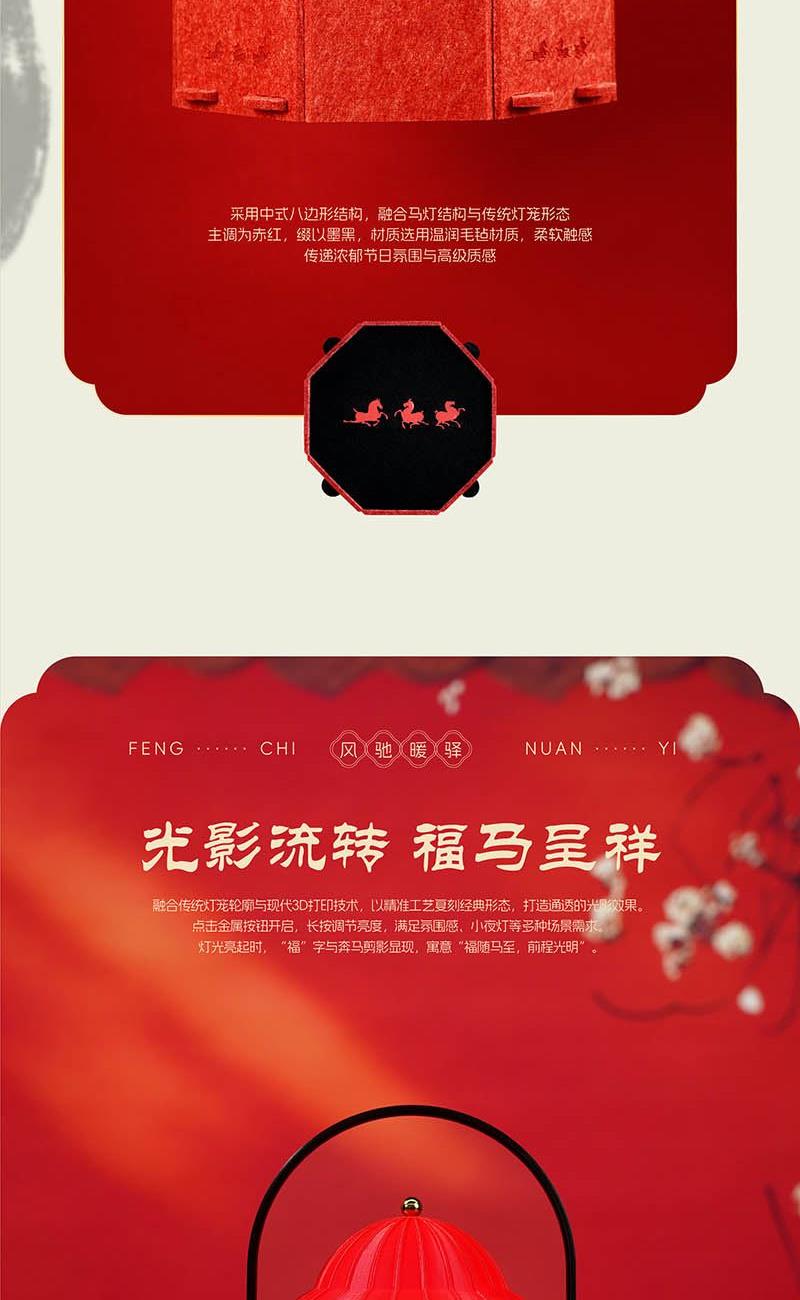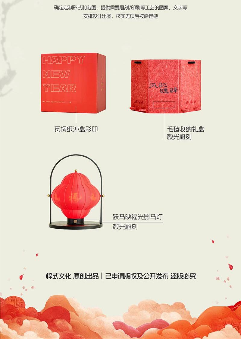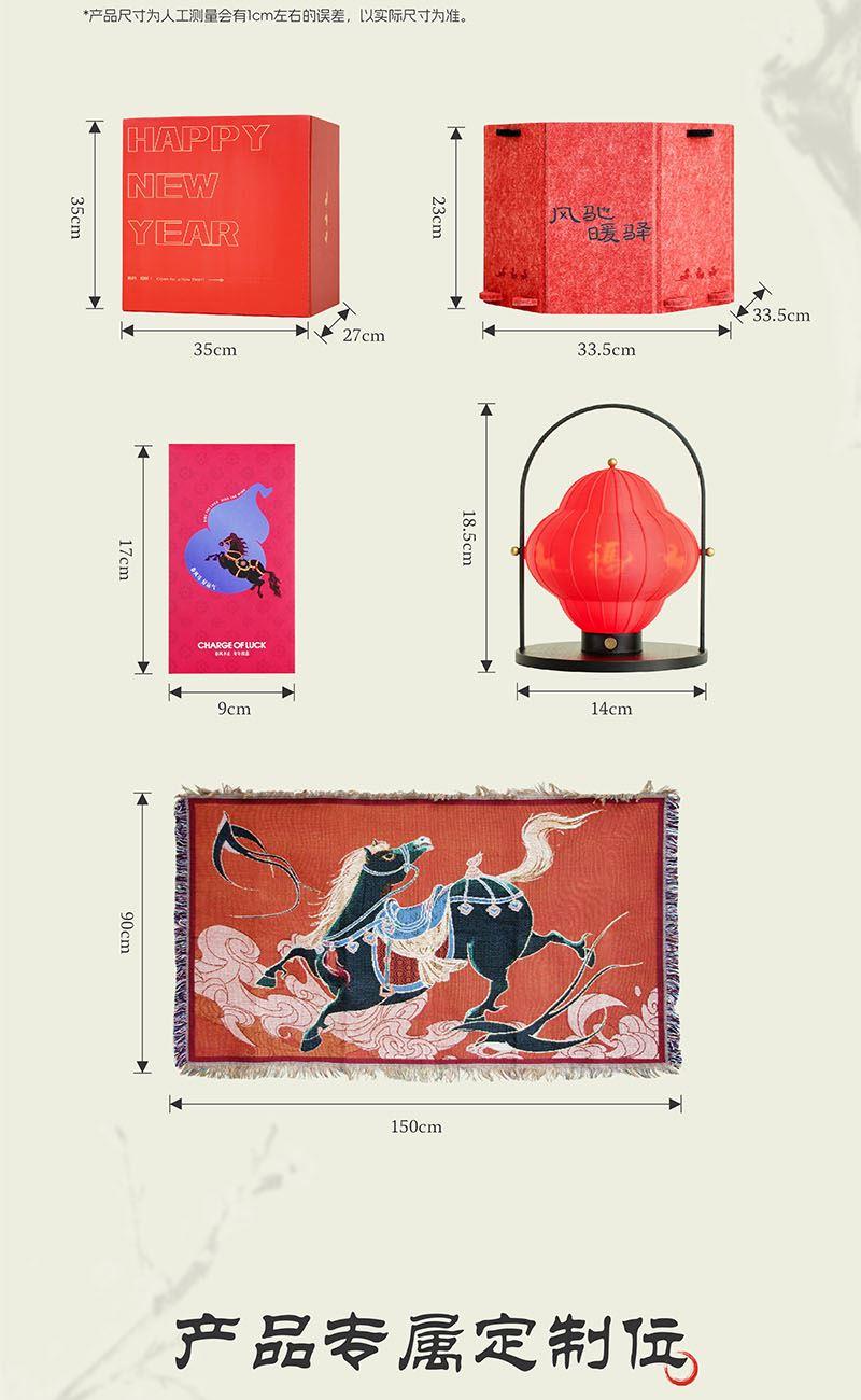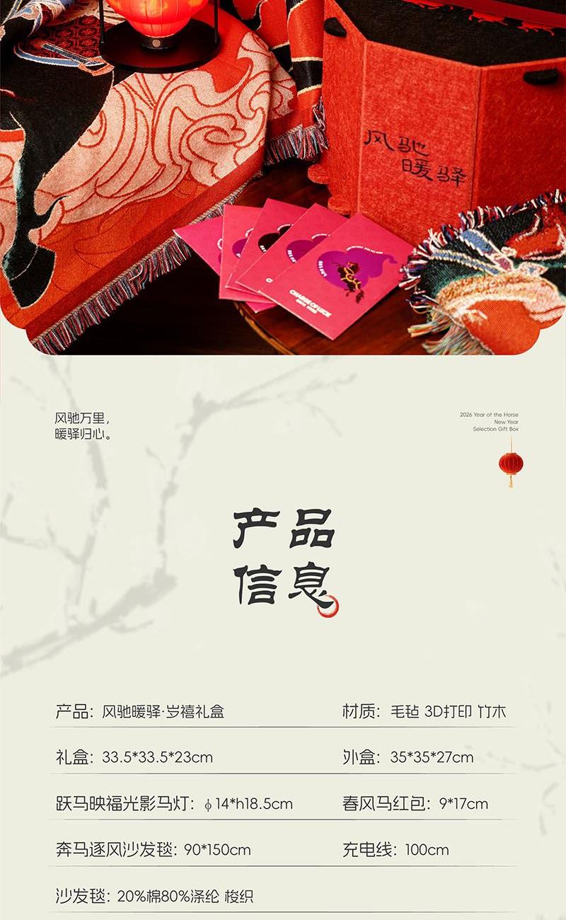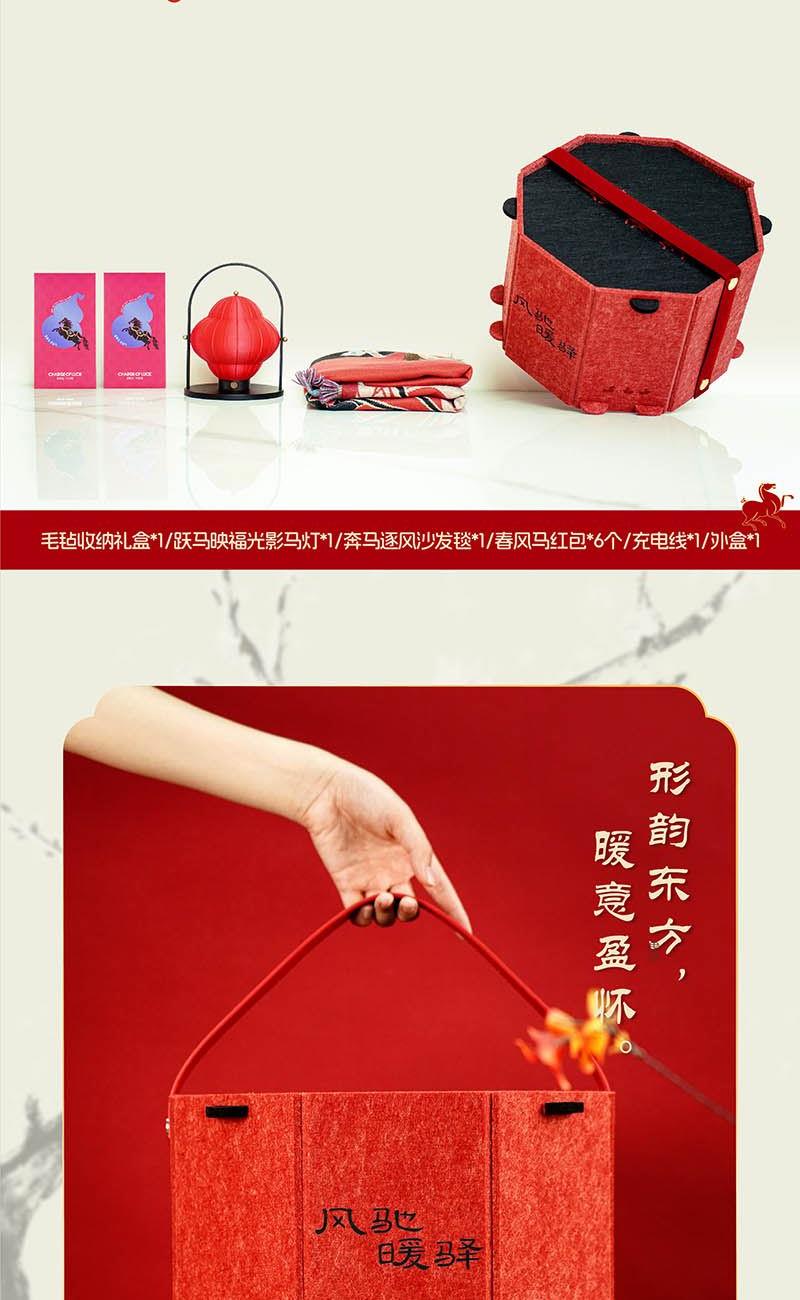 礼盒清单 毛毡收纳礼盒*1 光影拍拍马灯*1 奔马逐风沙发毯/盖毯*1 春风马红包*6个 充电线*1 外盒*1 产品信息 产品 / Product Mini 风驰暖驿·岁禧礼盒 材质 / Material 毛毡 3D打印 竹木 规格 / Size 礼盒:33.5*33.5*23cm礼袋:35*35*27cm 光影马灯:φ14*h18.5cm 马年沙发毯/盖毯:90*150cm 沙发毯:20%棉80%涤纶 春风马红包:9*17cm 充电线:100cm