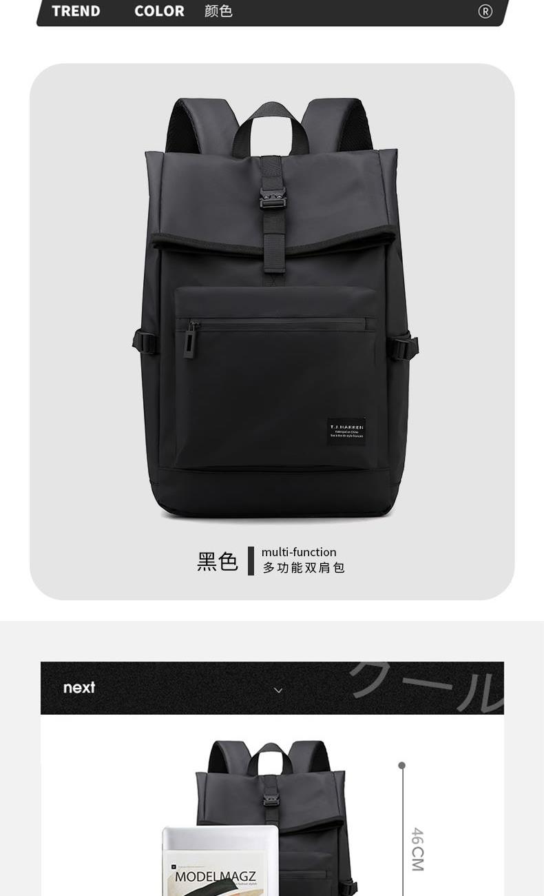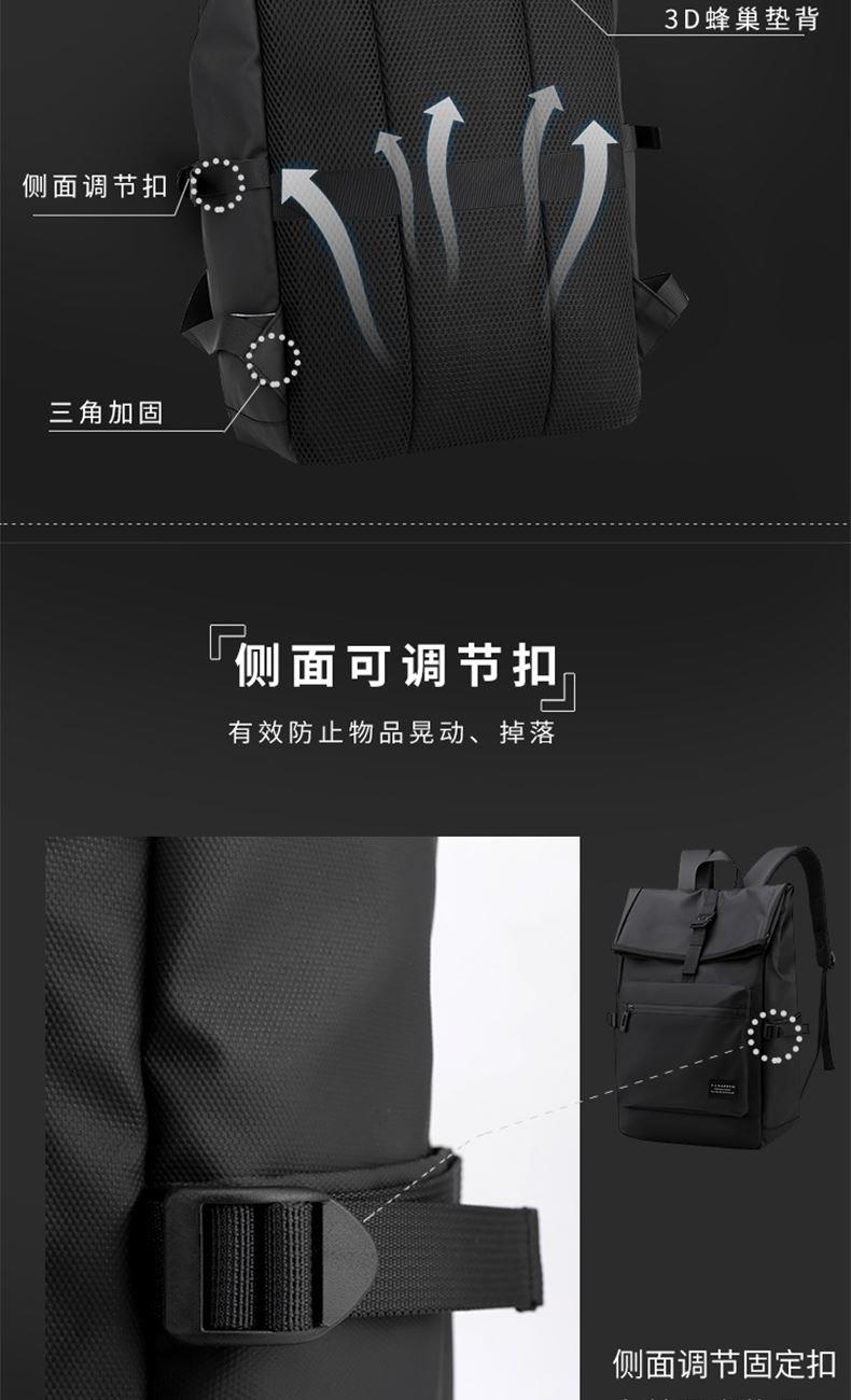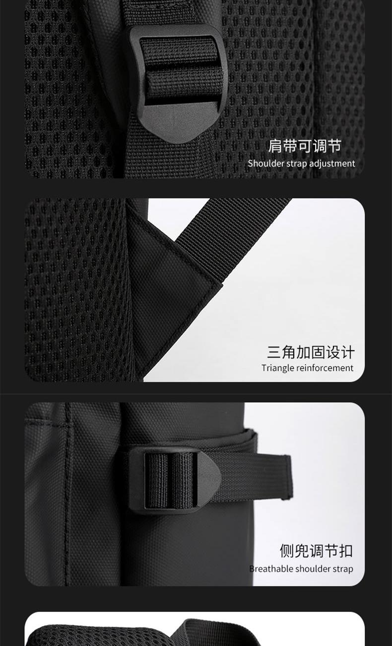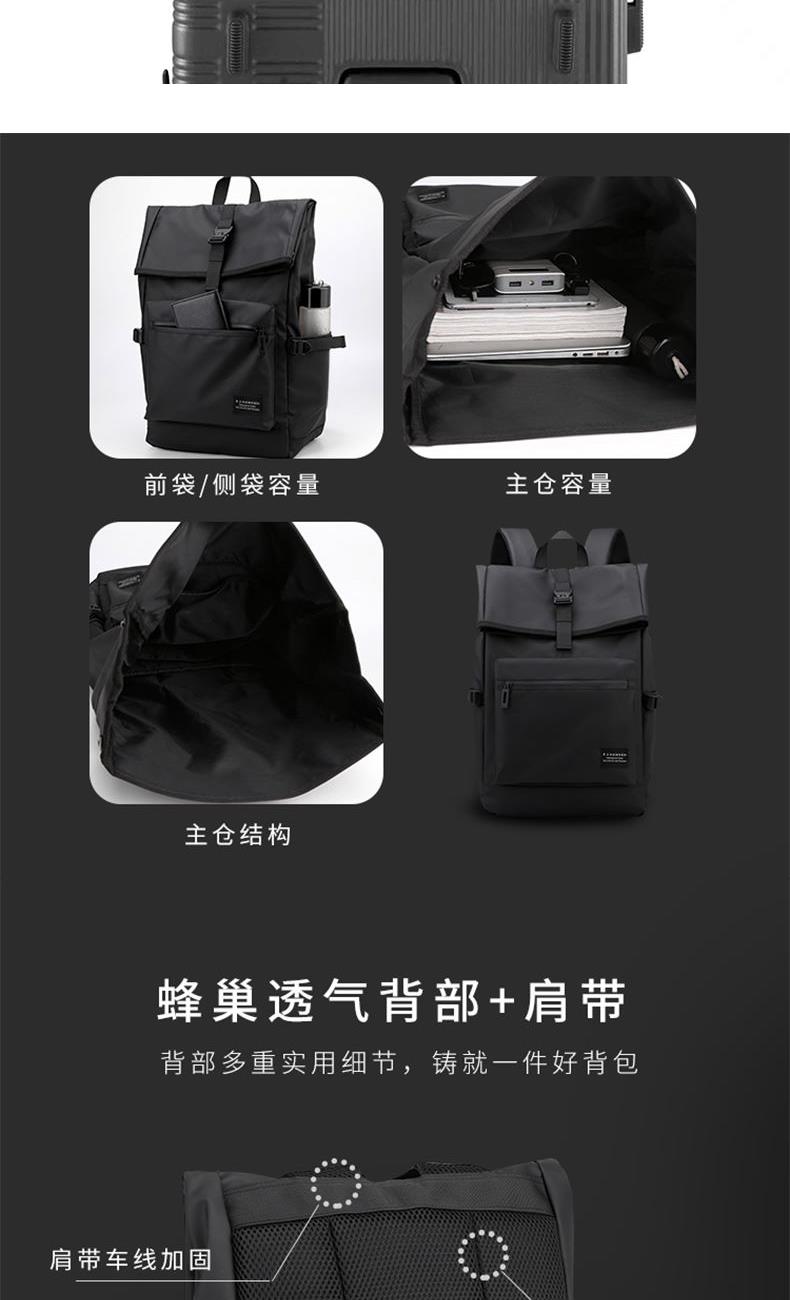1、新款多功能设计,时尚大方,旅行休闲商务三用;2、柔性防水皮膜面料,一擦即干,轻松打理;3、多隔层结构,分区合理,轻松收纳;4、主袋约17L大容量,同时收口处可灵活扩展容量,装的更多;5、独立加棉加厚电脑隔层袋,可放置15.6寸电脑;6、前置拉链袋、侧袋及内置袋,放置贴身物品;7、拉杆固定束带设计,解放双手;8、透气背负系统,配合加大加厚提手与肩带,可背可提、透气干爽,舒适减压出行;9、支持客户定制