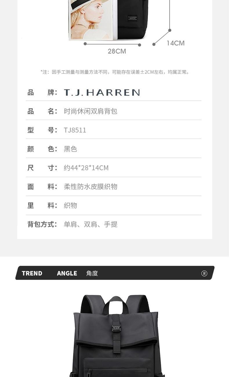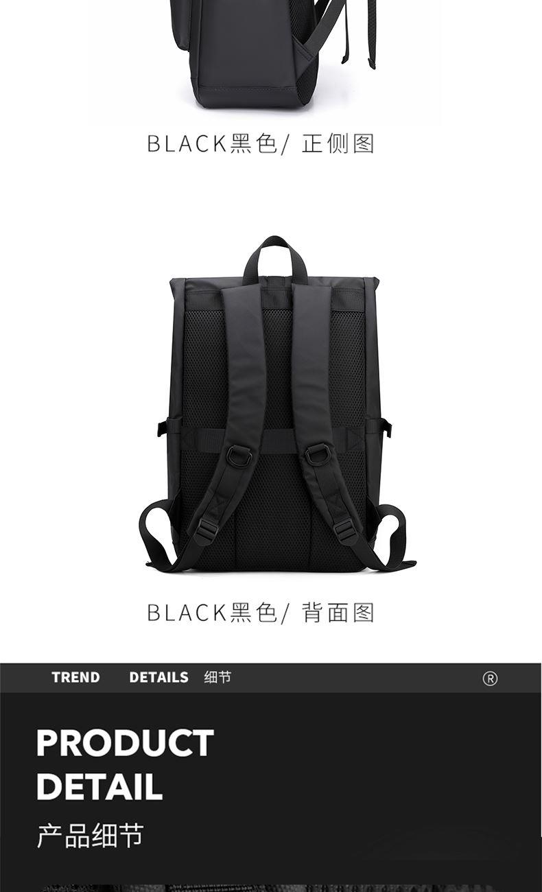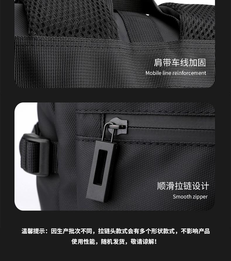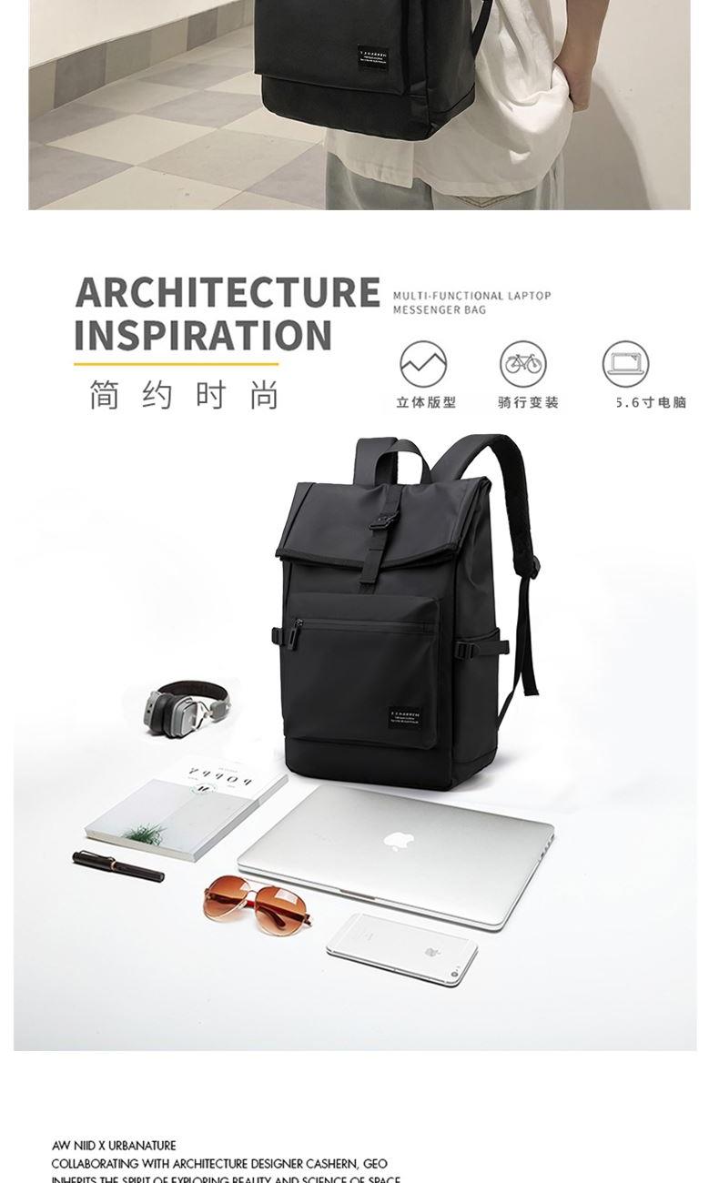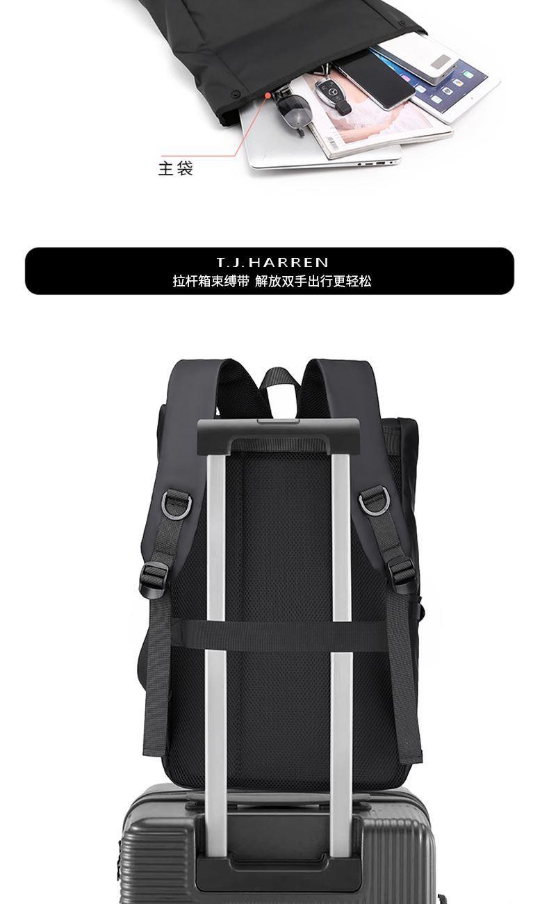 1、新款多功能设计,时尚大方,旅行休闲商务三用;2、柔性防水皮膜面料,一擦即干,轻松打理;3、多隔层结构,分区合理,轻松收纳;4、主袋约17L大容量,同时收口处可灵活扩展容量,装的更多;5、独立加棉加厚电脑隔层袋,可放置15.6寸电脑;6、前置拉链袋、侧袋及内置袋,放置贴身物品;7、拉杆固定束带设计,解放双手;8、透气背负系统,配合加大加厚提手与肩带,可背可提、透气干爽,舒适减压出行;9、支持客户定制