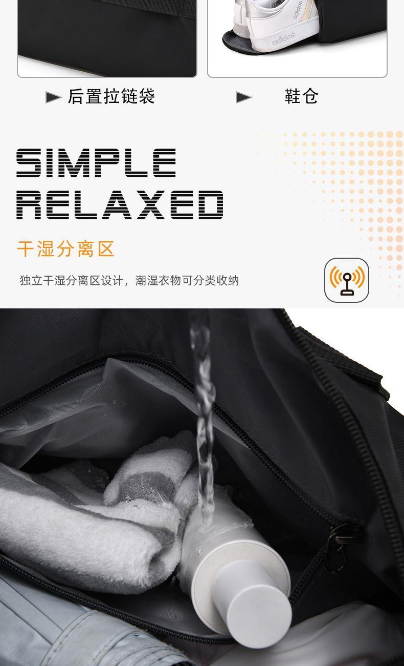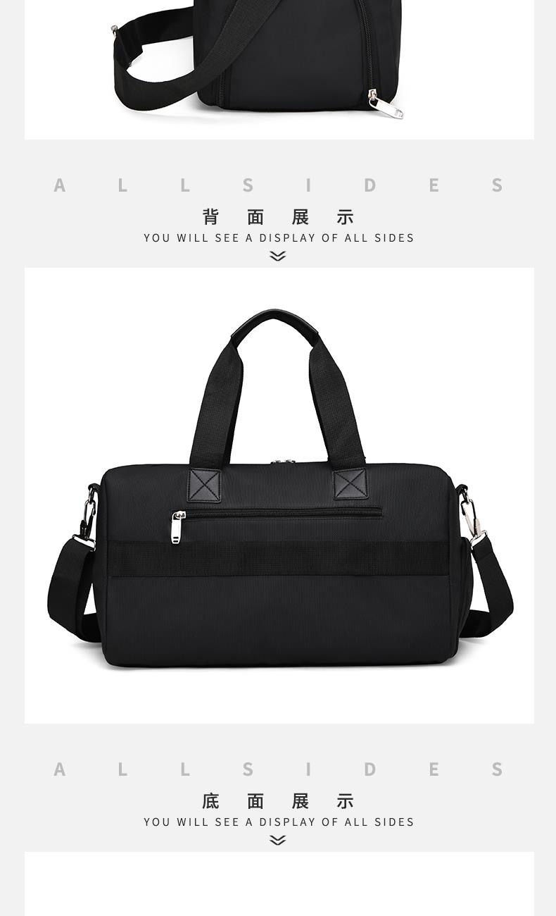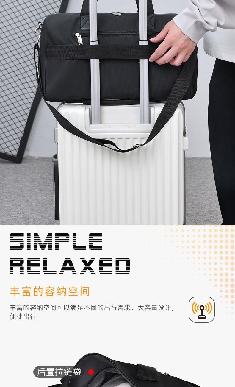 1、新款轻量化设计,双色可选,轻盈时尚,大小适中,通勤旅行健身三用;2、柔性防水皮膜面料,一擦即干,轻松打理;3、优质金属拉链及扣件,更有档次;4、多隔层结构,分区合理,轻松收纳;5、独立鞋仓设计,干净易清理;6、前置及后置各1个拉链袋,放置贴身物品;7、内置干湿分离袋,分区收纳;8、拉杆固定束带设计,解放双手;9、舒适皮质提手与加大加厚肩带,可背可提,出行更方便;11、支持客户定制。