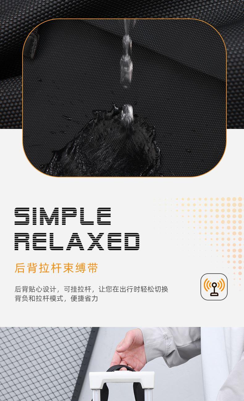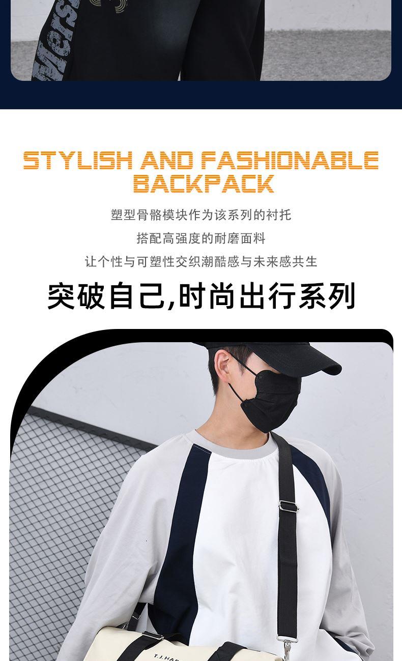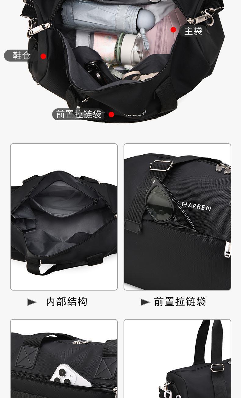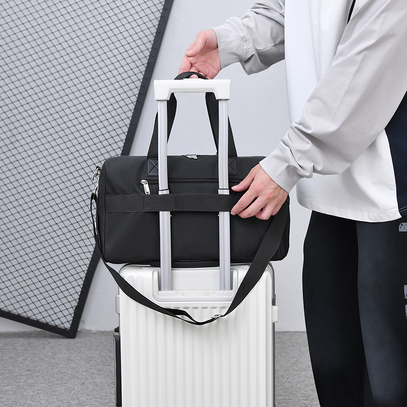 1、新款轻量化设计,双色可选,轻盈时尚,大小适中,通勤旅行健身三用;2、柔性防水皮膜面料,一擦即干,轻松打理;3、优质金属拉链及扣件,更有档次;4、多隔层结构,分区合理,轻松收纳;5、独立鞋仓设计,干净易清理;6、前置及后置各1个拉链袋,放置贴身物品;7、内置干湿分离袋,分区收纳;8、拉杆固定束带设计,解放双手;9、舒适皮质提手与加大加厚肩带,可背可提,出行更方便;11、支持客户定制。