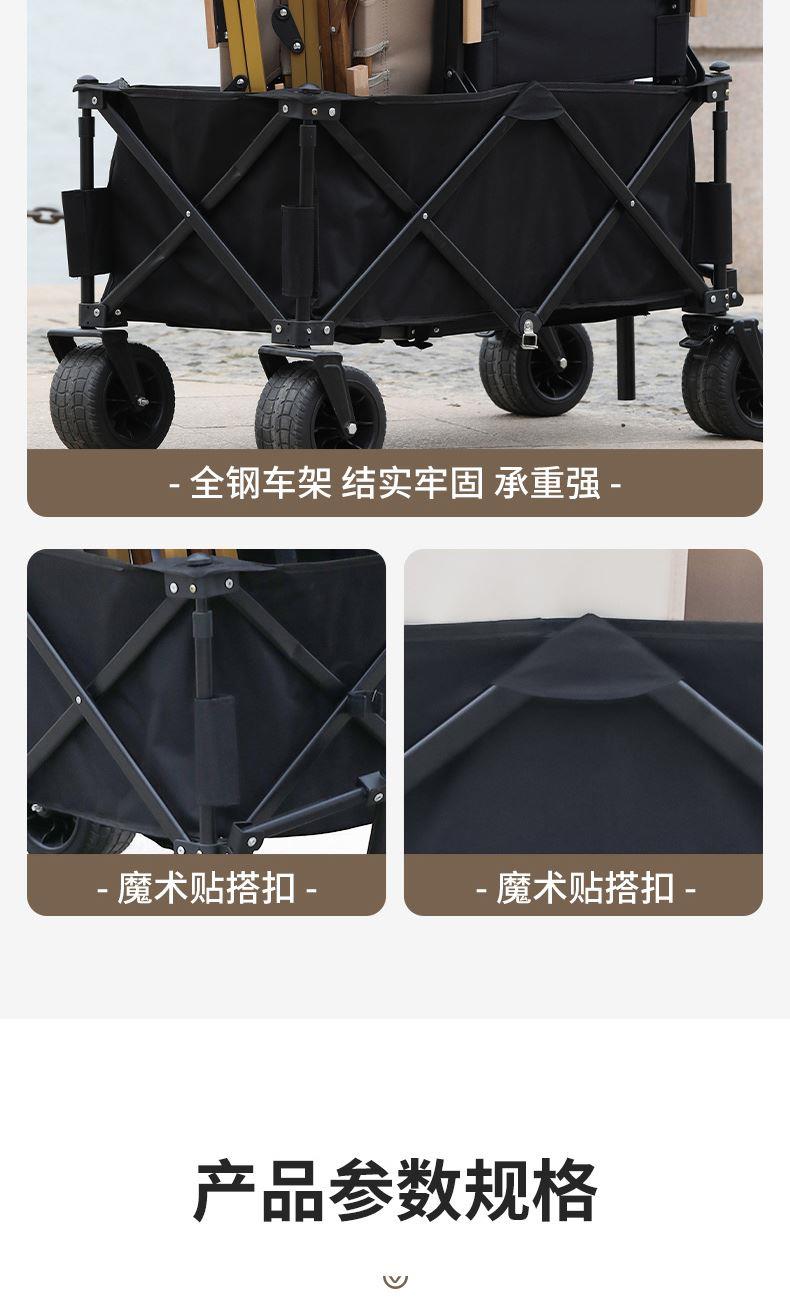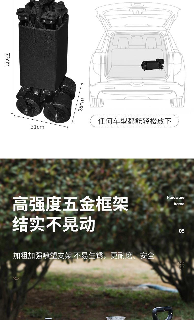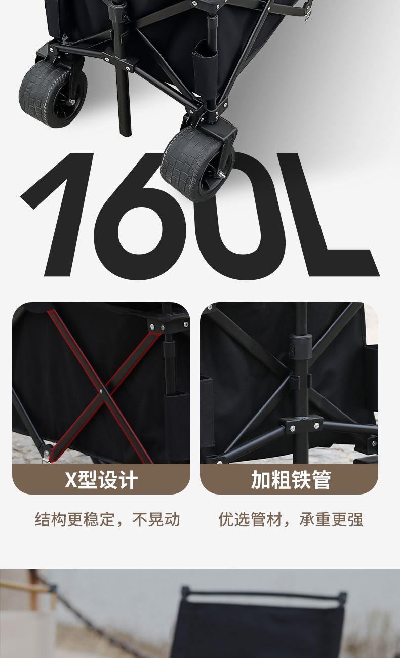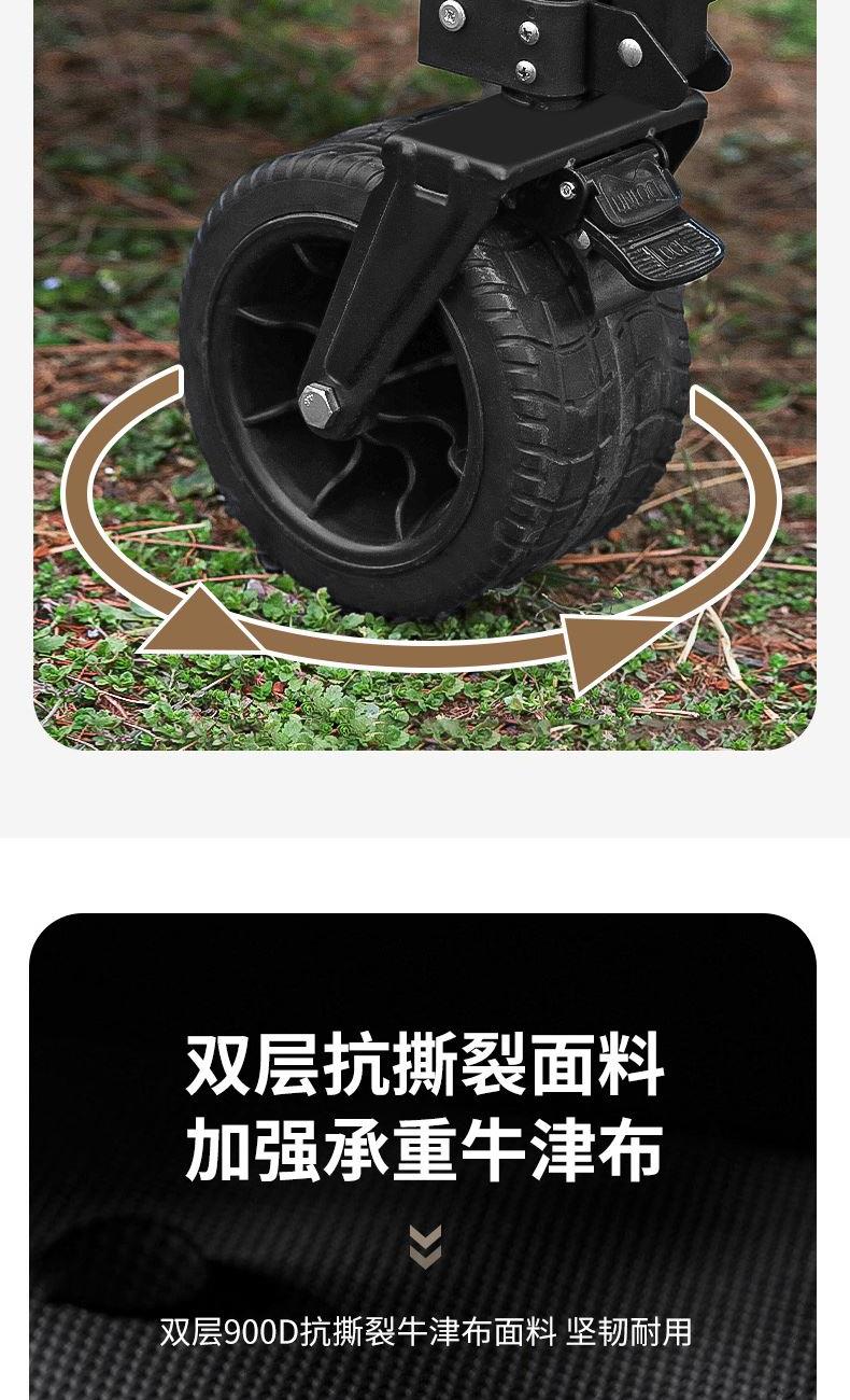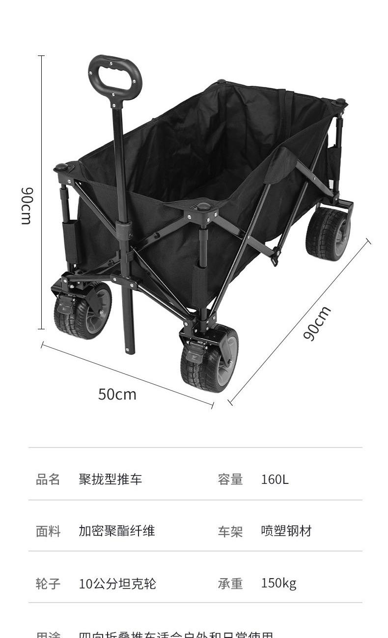货号:YT-LY27T 规格:160L 车身:90*50*35CM(折叠72*28*31CM) 桌板尺寸:90X55cm 轮子:10CM宽 刹车坦克轮 承重:125kg 材质:车身喷塑钢管,面料600D牛津布; 颜色:黑色 卖点:双刹车设计,30°压力转向轴承,越野宽轮,适合各种地形;可调节拉手,收纳方便,适合野营,郊游,钓鱼等户外活动