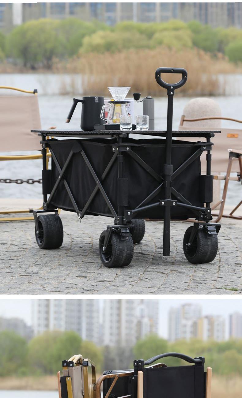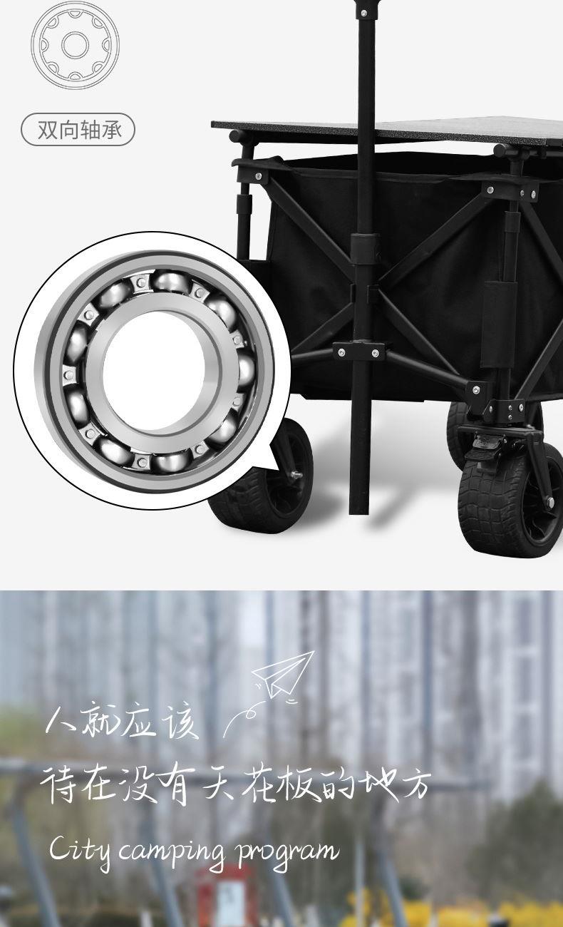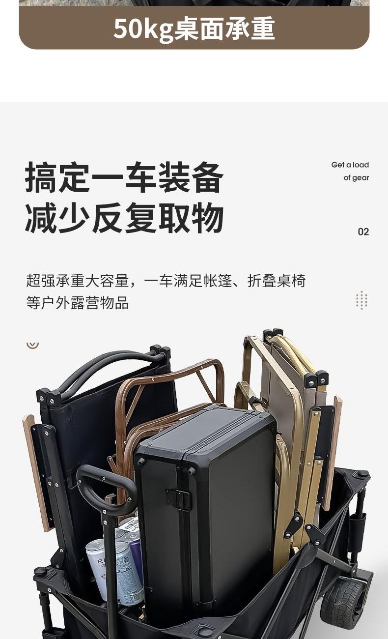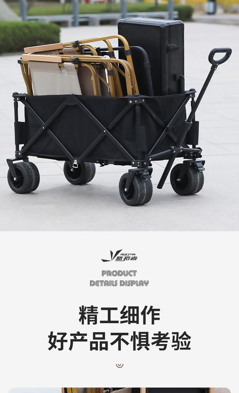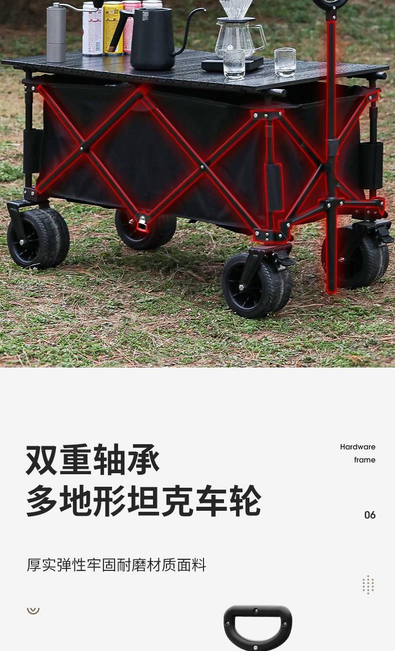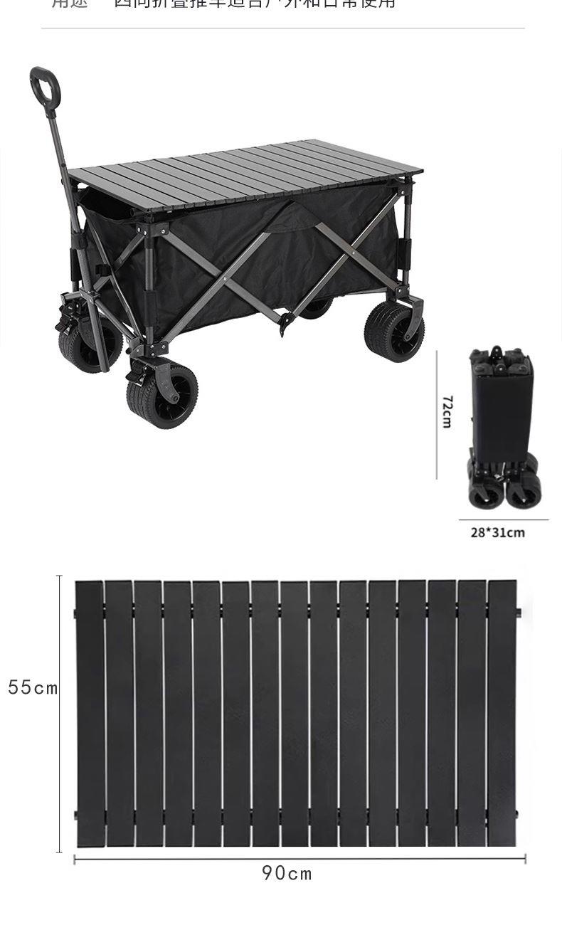货号:YT-LY27T 规格:160L 车身:90*50*35CM(折叠72*28*31CM) 桌板尺寸:90X55cm 轮子:10CM宽 刹车坦克轮 承重:125kg 材质:车身喷塑钢管,面料600D牛津布; 颜色:黑色 卖点:双刹车设计,30°压力转向轴承,越野宽轮,适合各种地形;可调节拉手,收纳方便,适合野营,郊游,钓鱼等户外活动