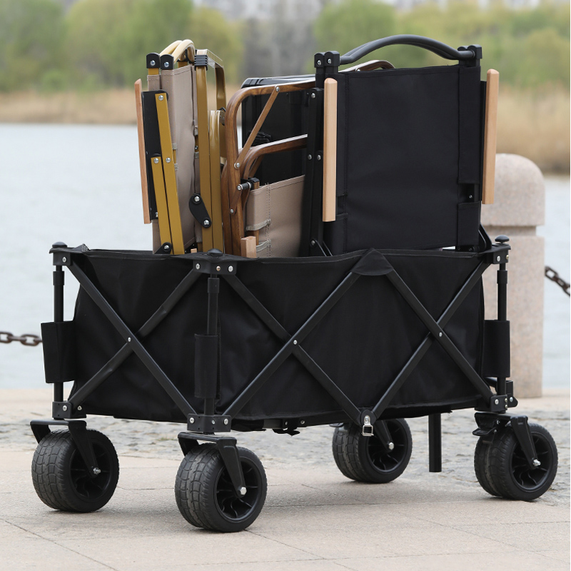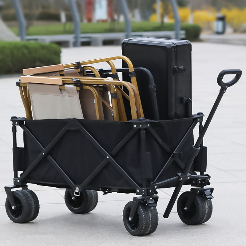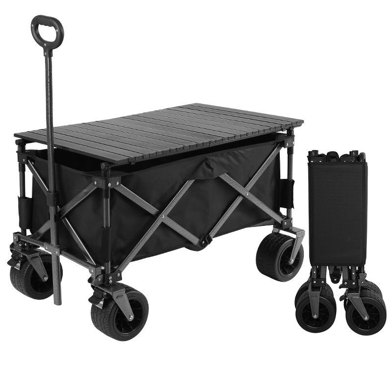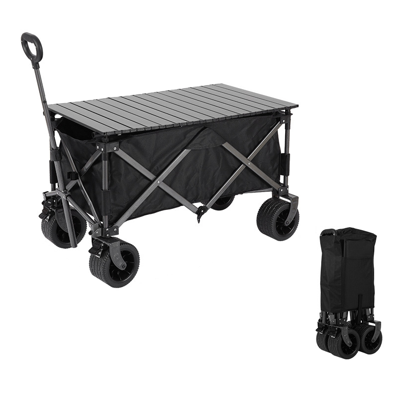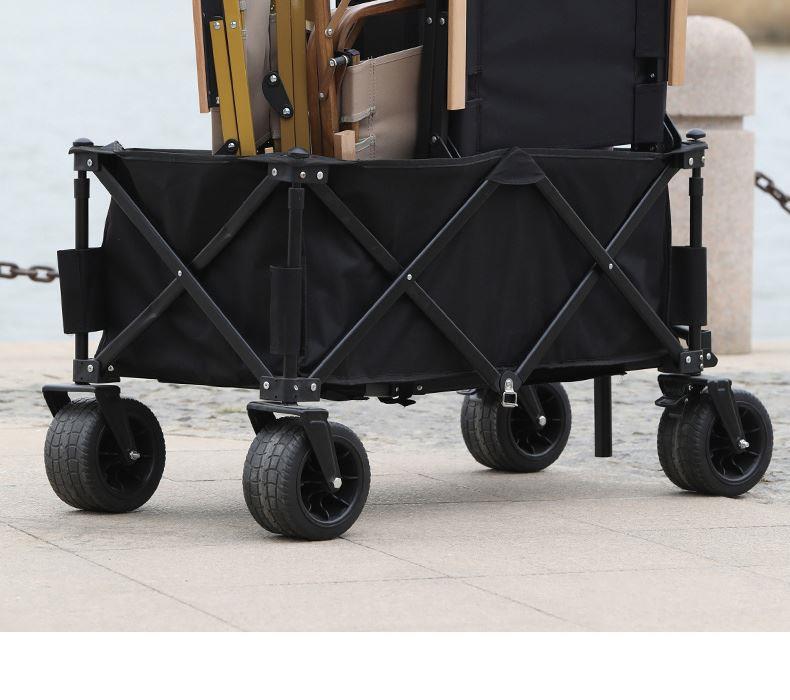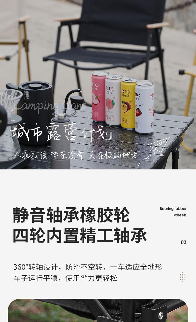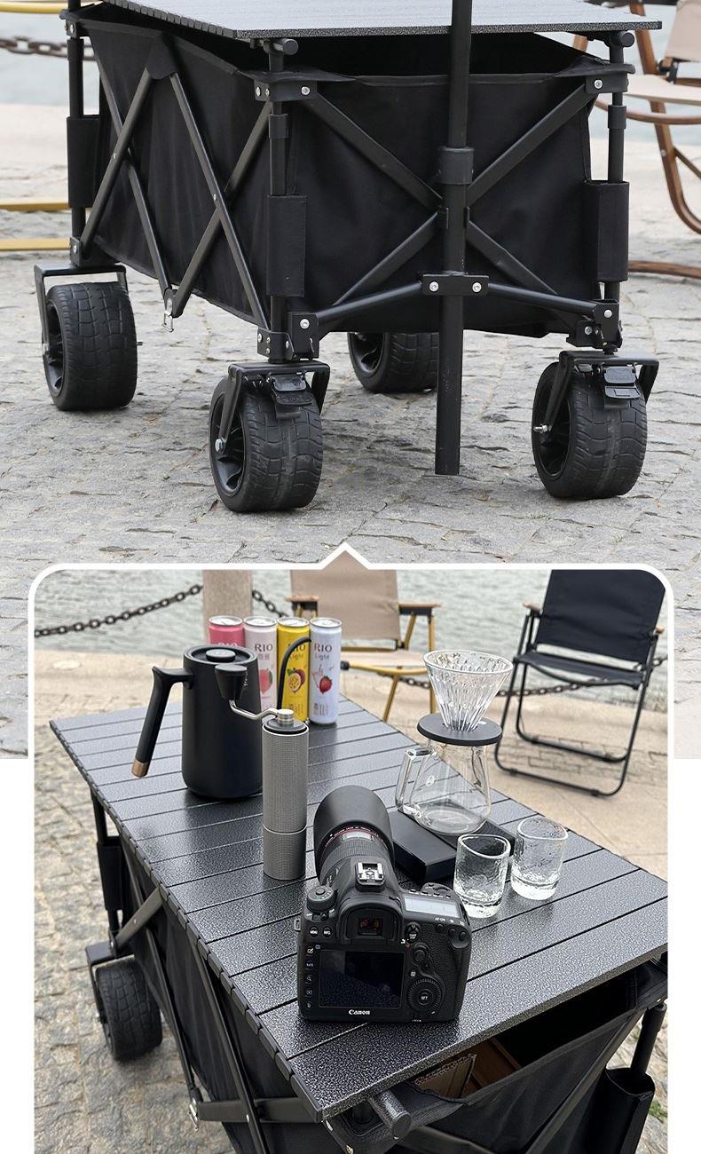 货号:YT-LY27T 规格:160L 车身:90*50*35CM(折叠72*28*31CM) 桌板尺寸:90X55cm 轮子:10CM宽 刹车坦克轮 承重:125kg 材质:车身喷塑钢管,面料600D牛津布; 颜色:黑色 卖点:双刹车设计,30°压力转向轴承,越野宽轮,适合各种地形;可调节拉手,收纳方便,适合野营,郊游,钓鱼等户外活动